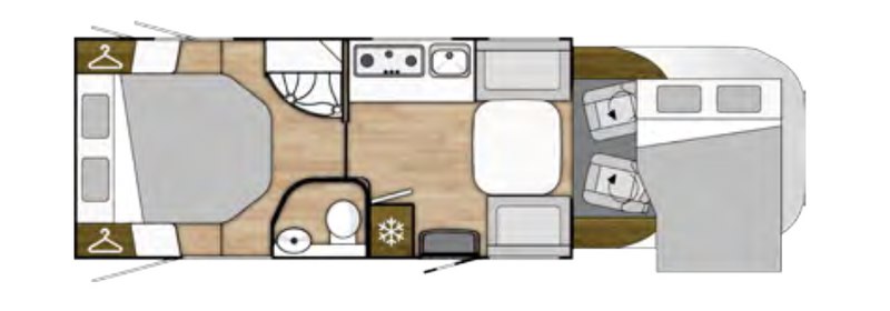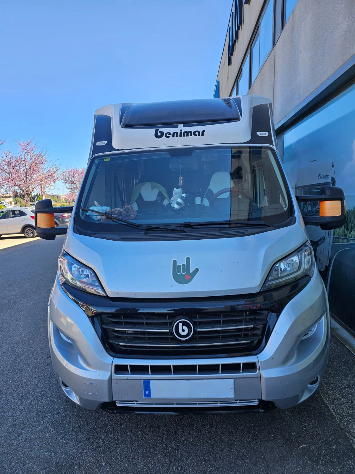 Autocaravana perfilada de segunda mano Benimar Perseo 597 en edición Globe Traveller sobre Fiat Ducato 160 CV, con camas gemelas traseras unificables, cama basculante eléctrica sobre cabina y gran garaje de doble acceso para viajes familiares cómodos.