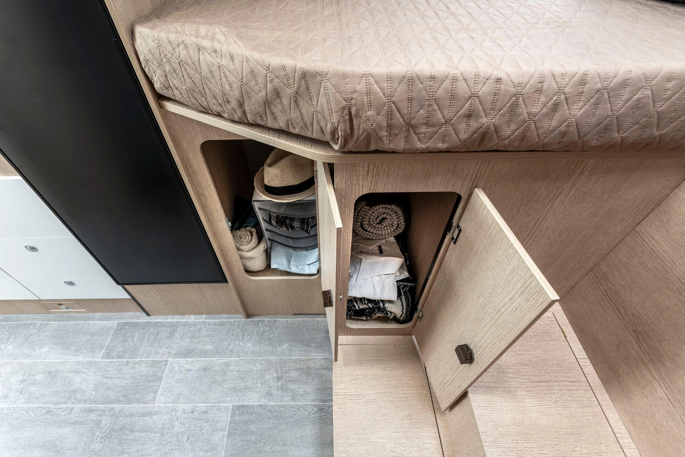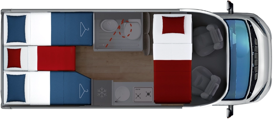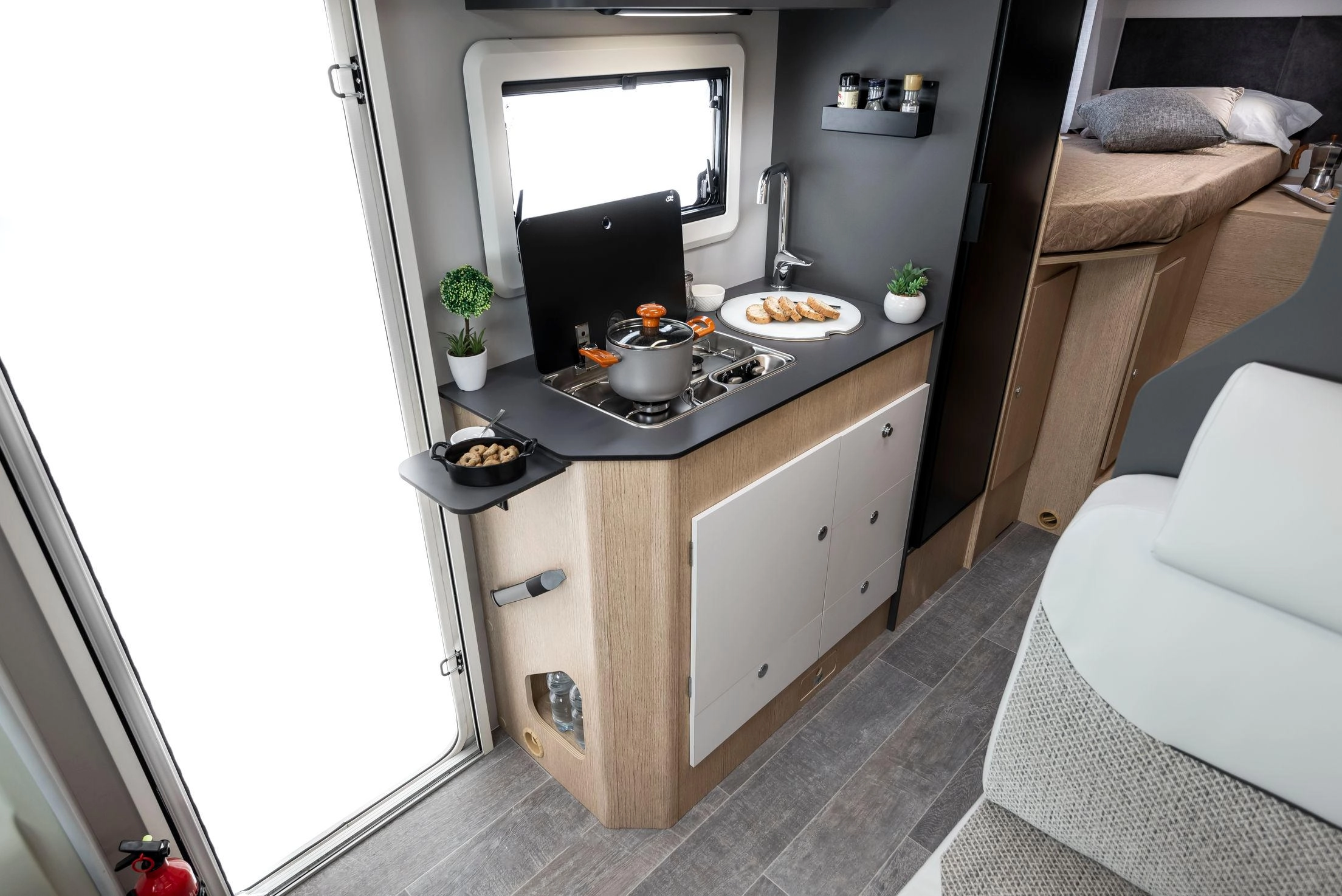 En su distribución interior ofrece camas gemelas traseras unificables, una cocina bien equipada con nevera de compresor de 140 L, un baño con ducha independiente y una zona de día con comedor cara a cara que invita a relajarse y compartir. Gracias a la cama basculante delantera opcional, puede alojar hasta 3+2 personas.