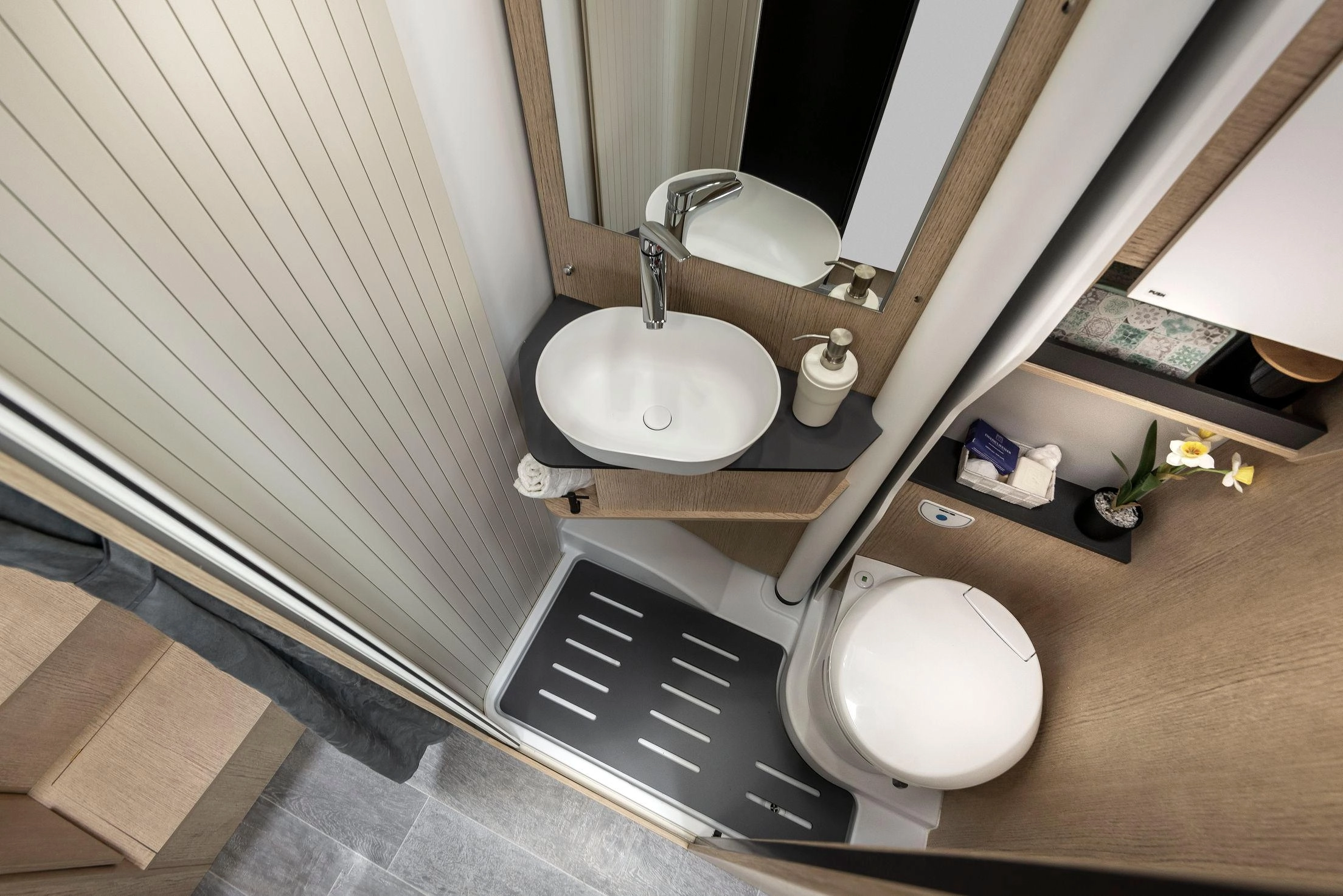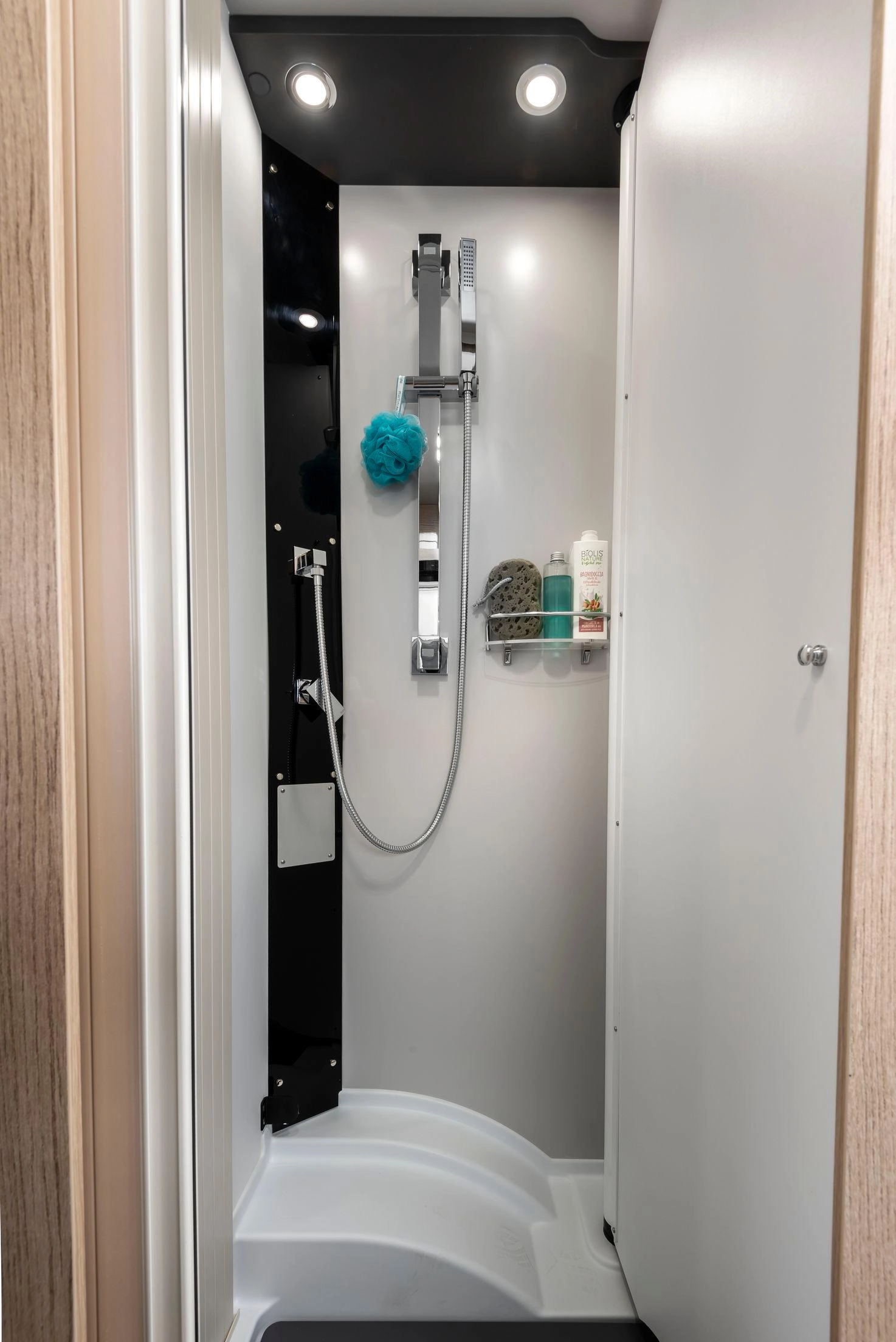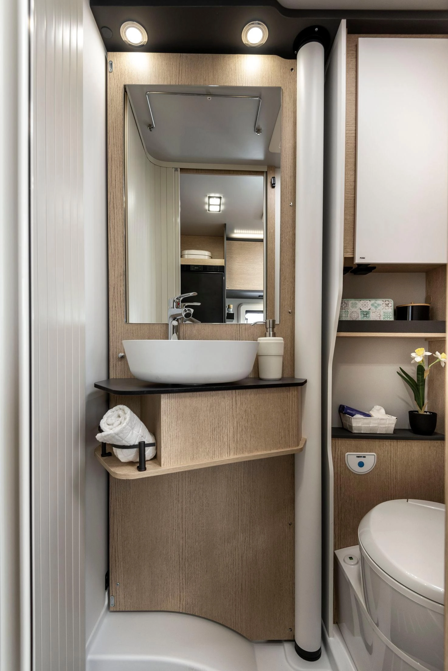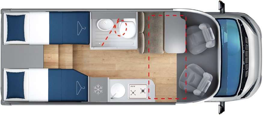 Esta unidad llega totalmente equipada con el Pack Privilege y el Pack Sport, que añaden detalles estéticos y de confort. Incorpora también cama eléctrica delantera para ampliar el descanso, cama adicional en la dinette para una quinta plaza, calefacción Truma Combi 6000 Diesel —más eficiente que la versión de gas— y oscurecedores plisados en cabina para mayor aislamiento térmico y privacidad. El garaje trasero (202 × 65 × 100 cm) permite cargar bicicletas y equipaje voluminoso sin sacrificar habitabilidad.