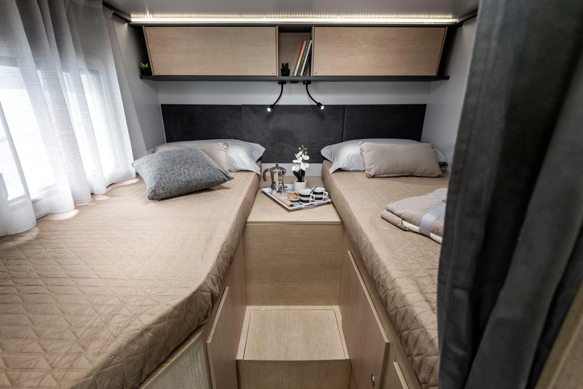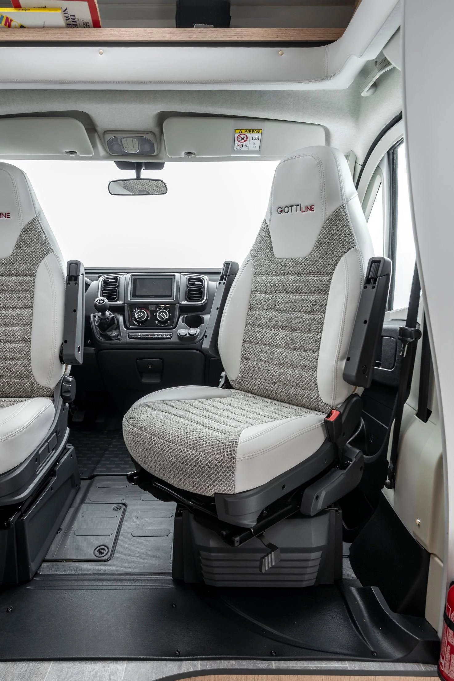 Autocaravana perfilada compacta Giottiline Compact CX66 sobre Fiat Ducato 140 CV, con camas gemelas traseras, cama eléctrica delantera y garaje práctico para hasta cinco viajeros.