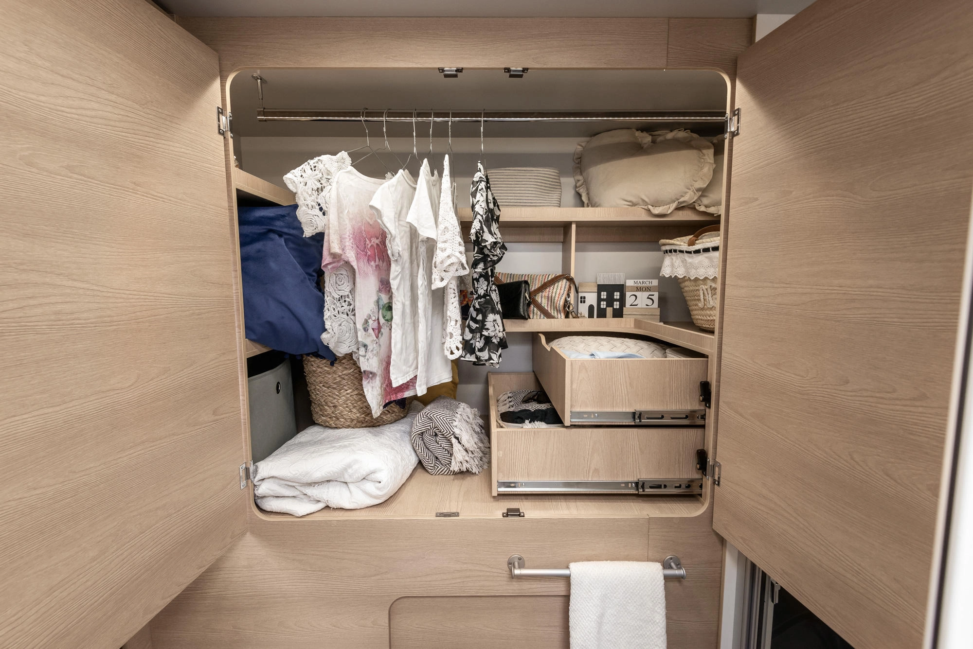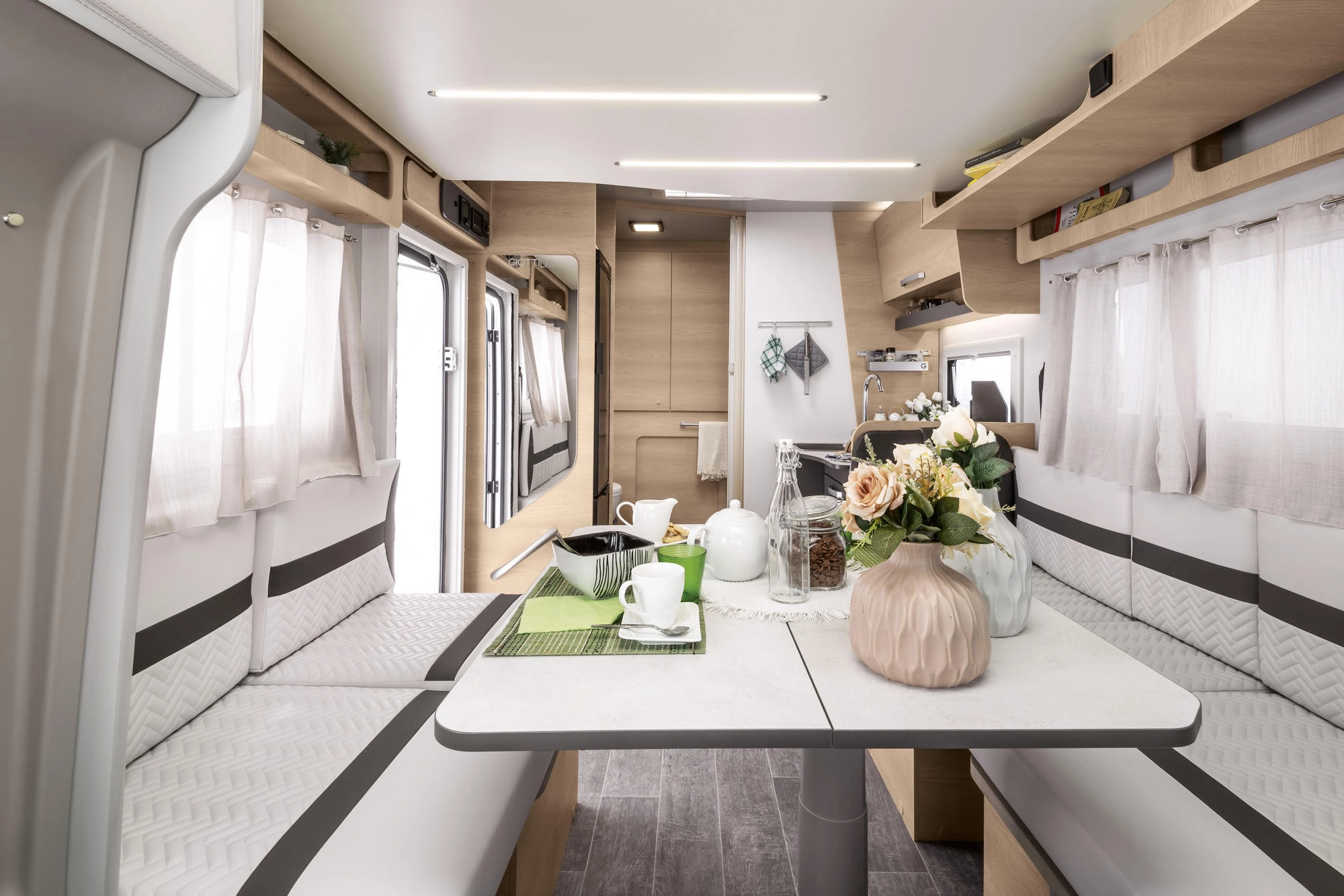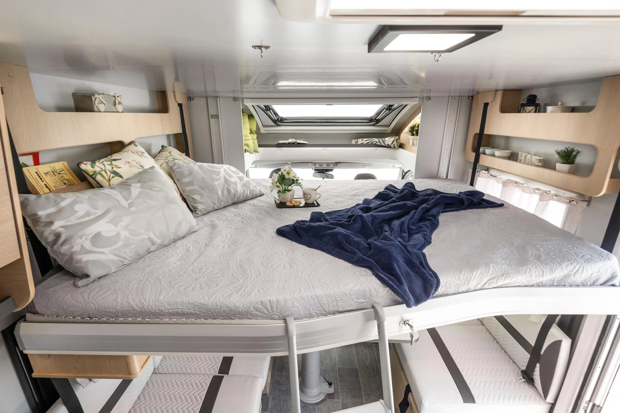 En su interior, la Siena 350 ofrece una zona de estar luminosa, una cocina funcional con todo lo necesario para el día a día y una cama trasera cómoda que garantiza un descanso reparador. El baño completo, junto con los numerosos espacios de almacenamiento, refuerza su practicidad y convierte cada escapada en una experiencia cómoda y organizada.