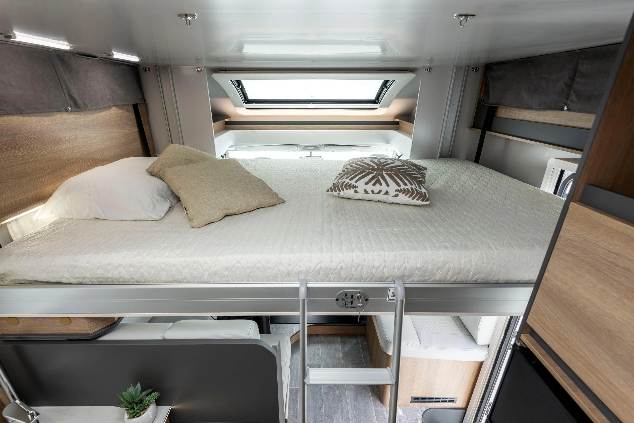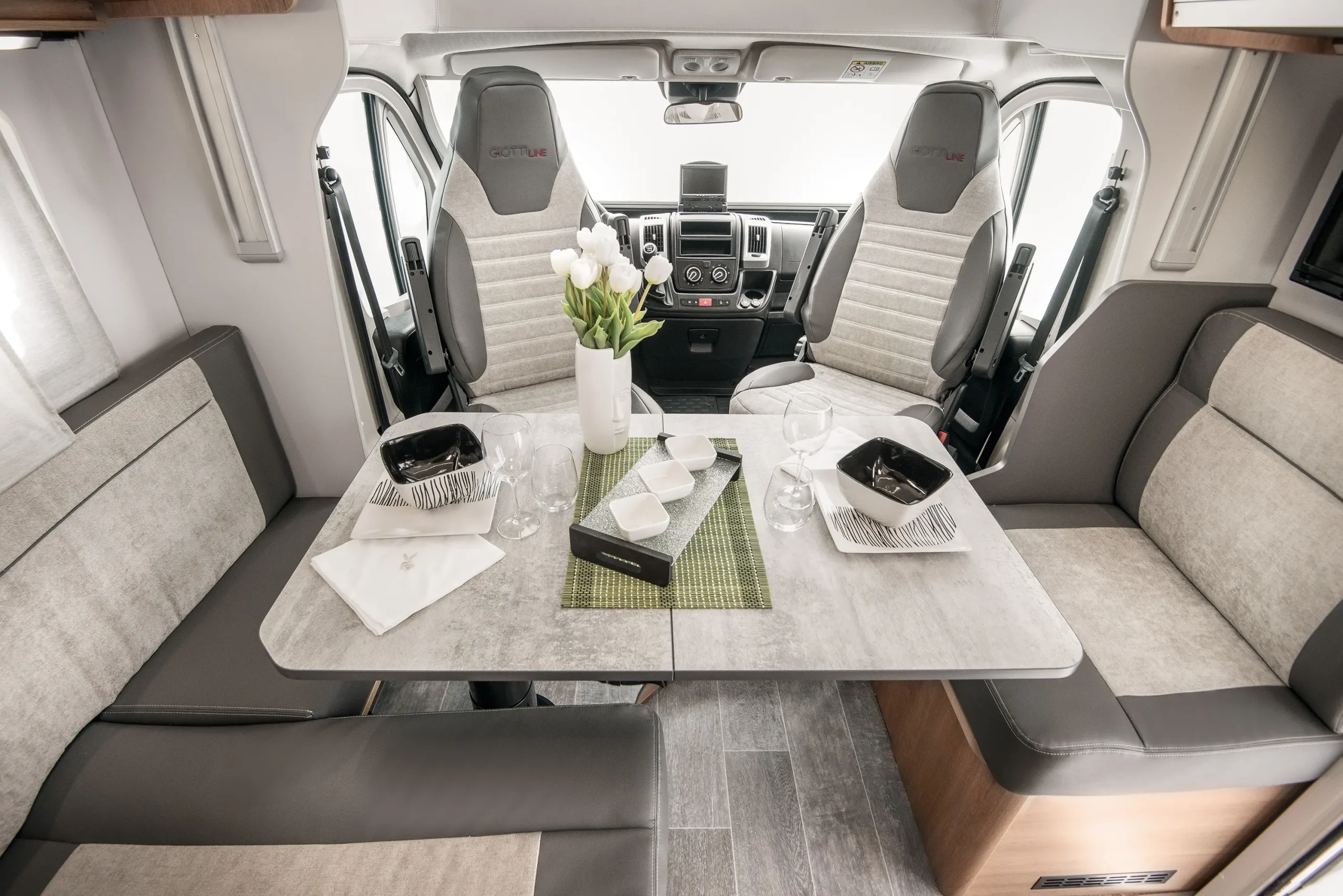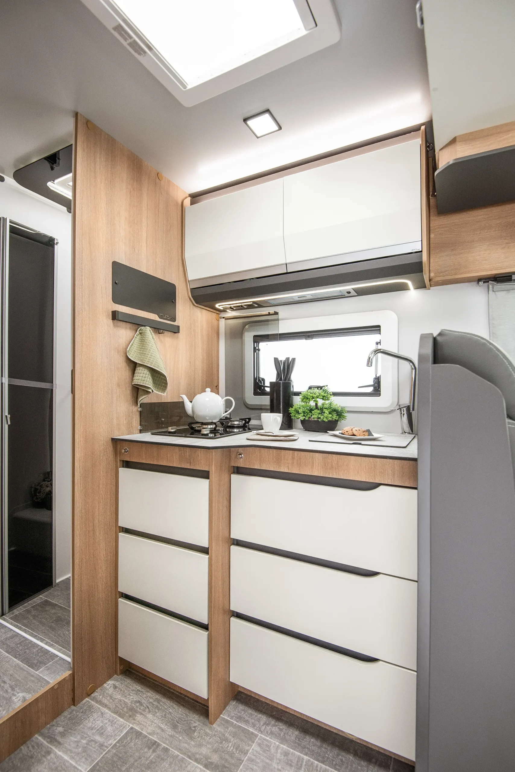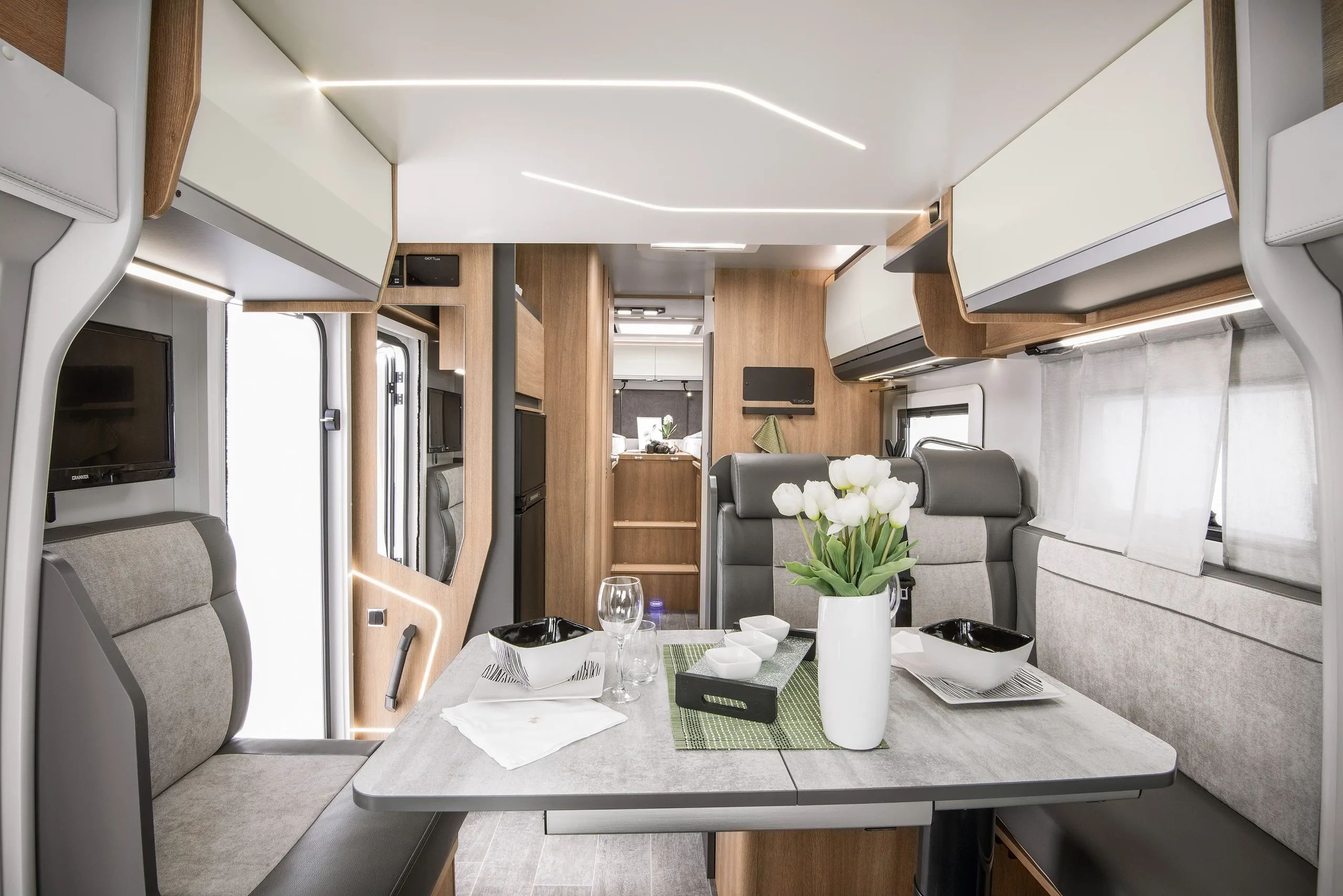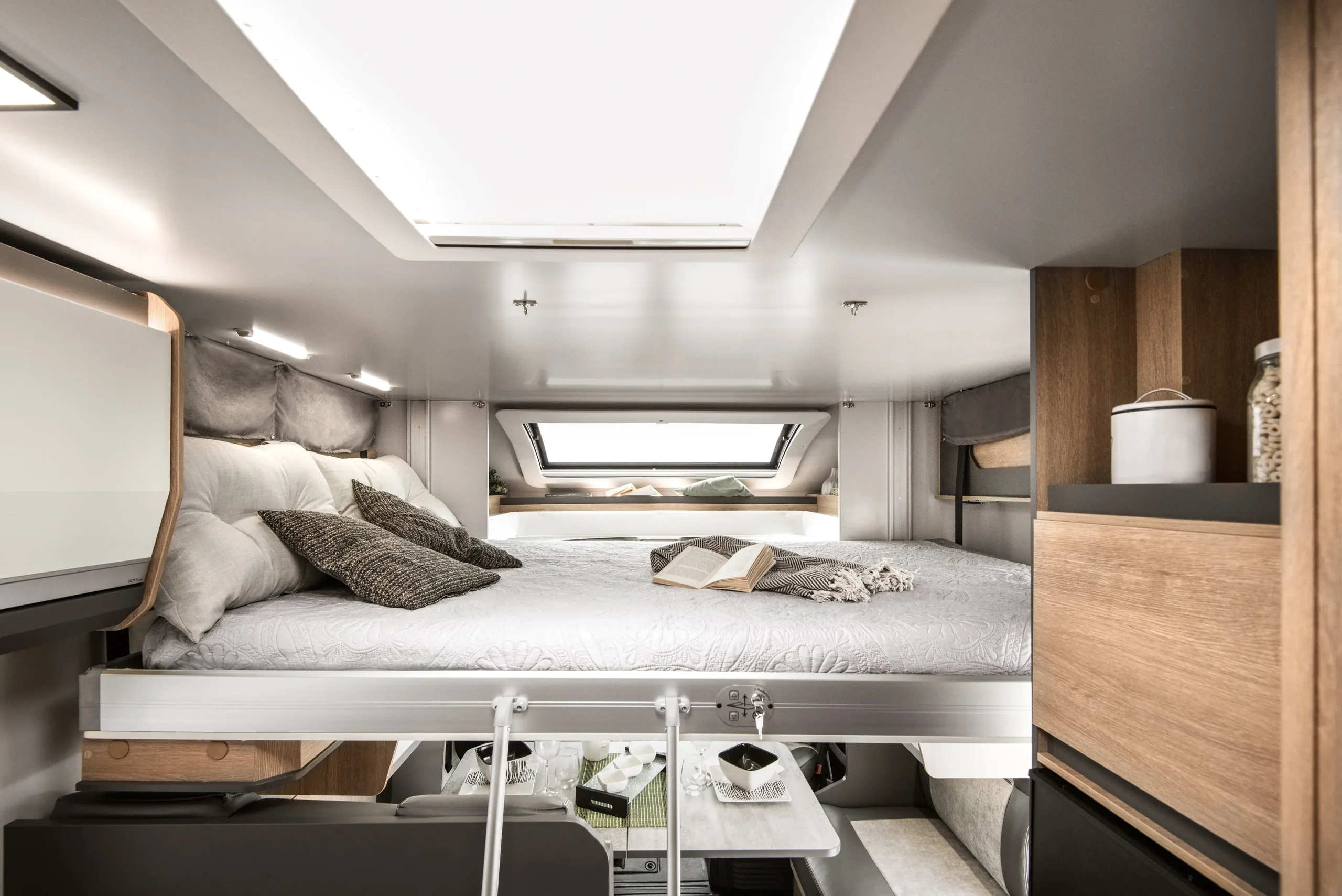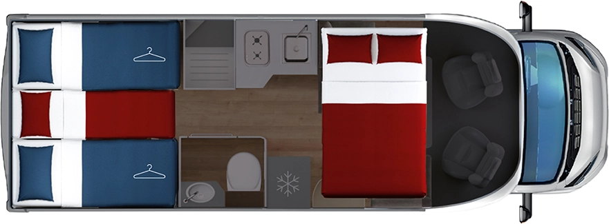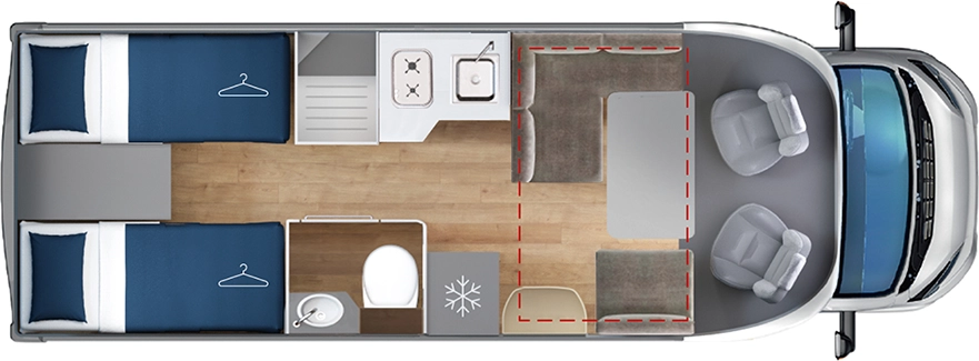 En su interior encontramos una cama central trasera y una cama basculante delantera, junto con una cocina completamente equipada, un baño con ducha independiente y un amplio salón con asientos enfrentados que crea un ambiente acogedor y social. Todo ello acompañado por una estética moderna y una excelente iluminación natural.
