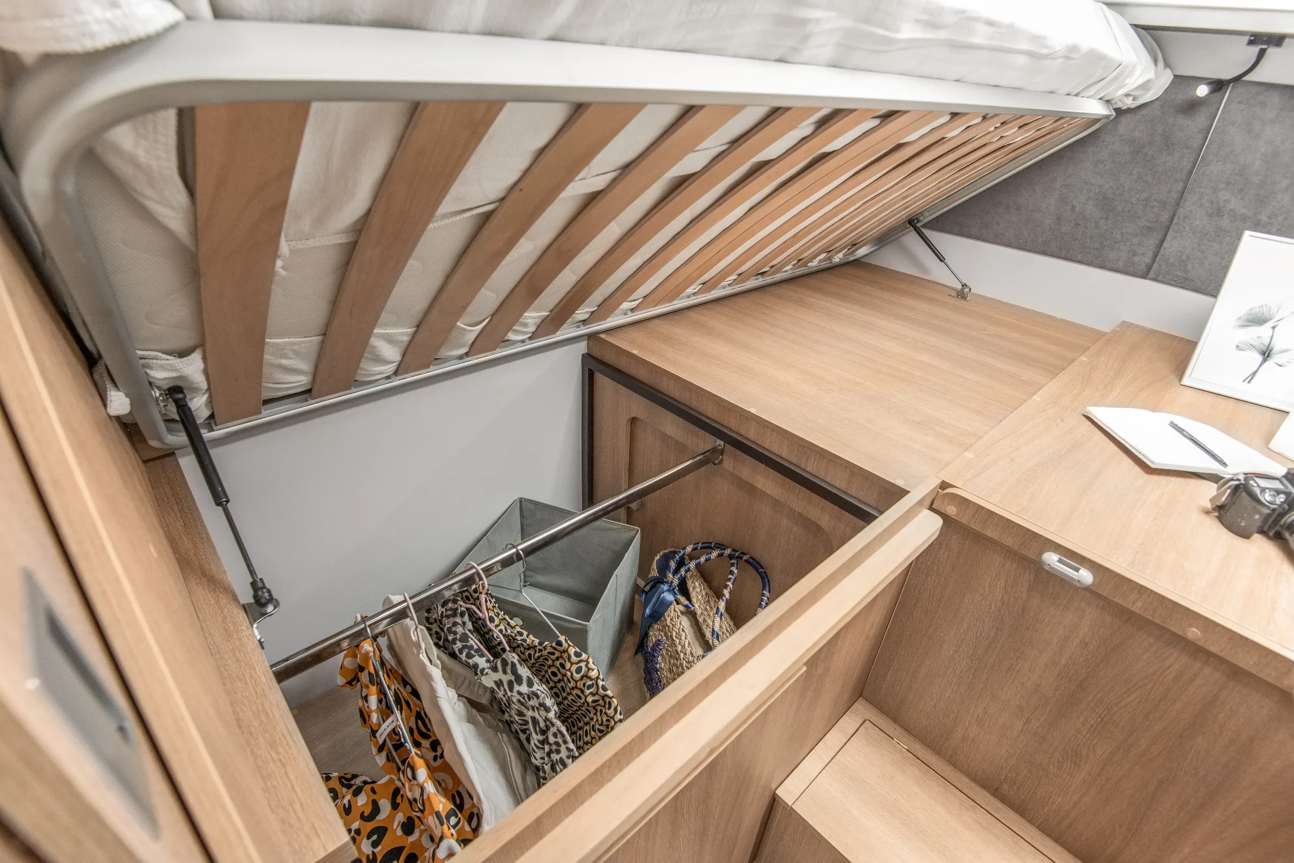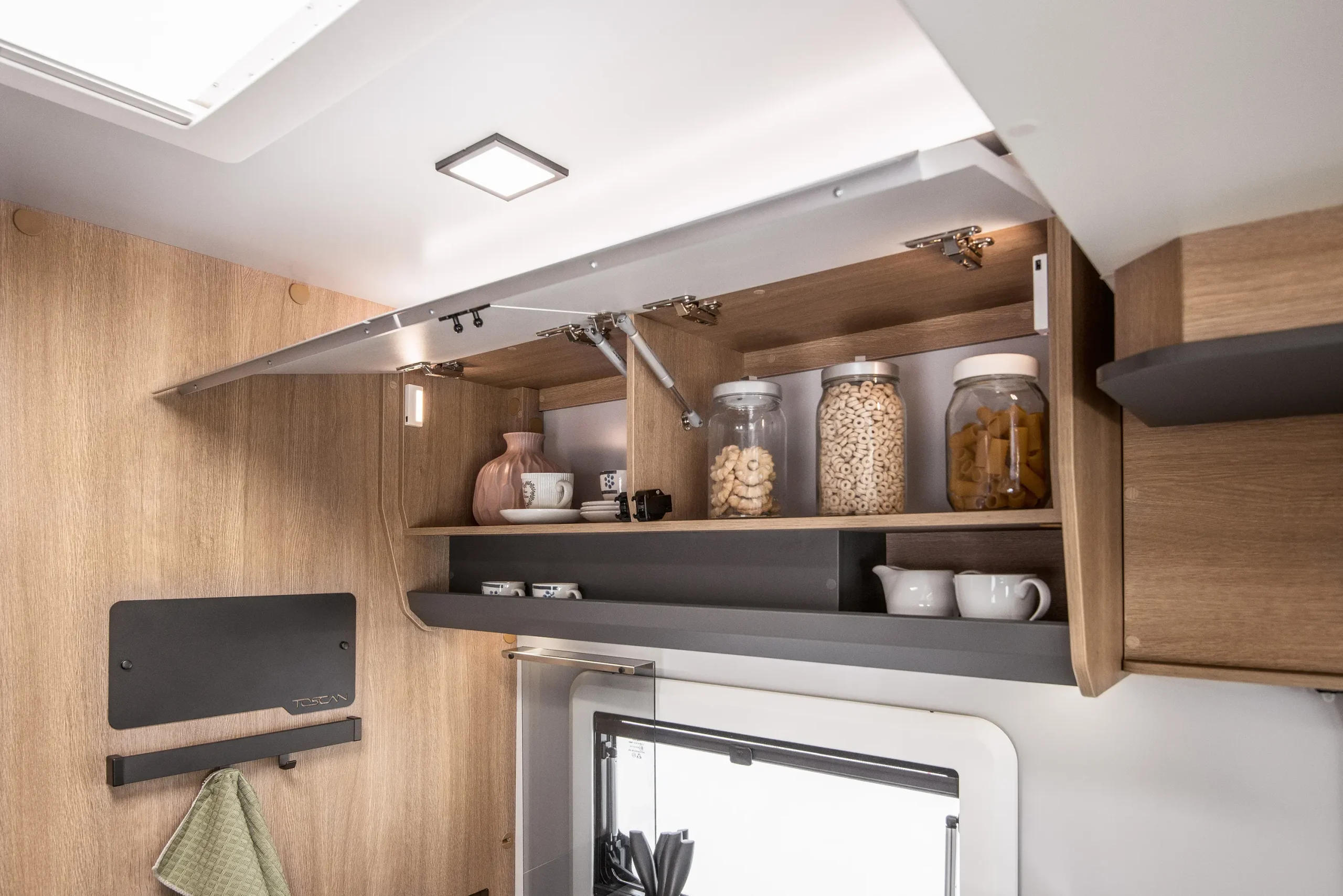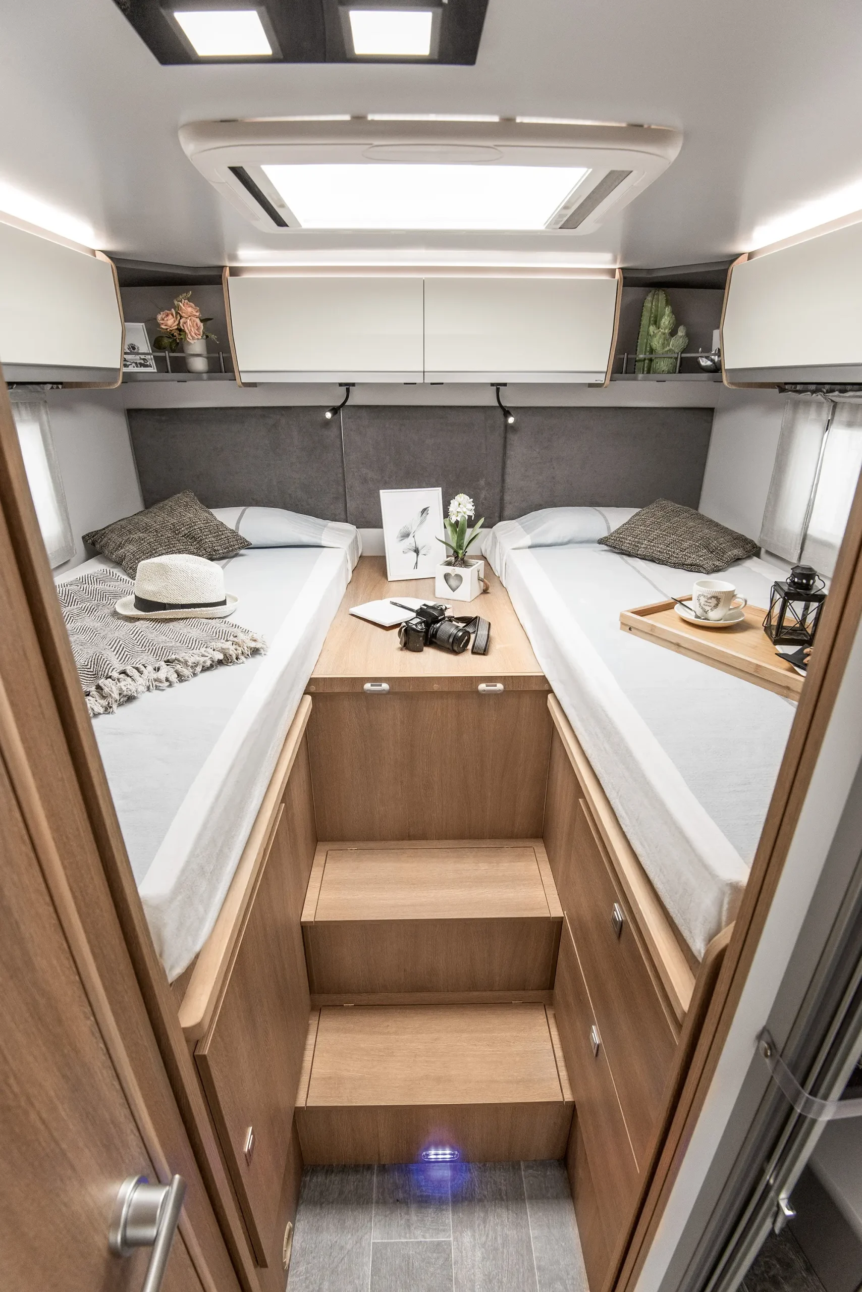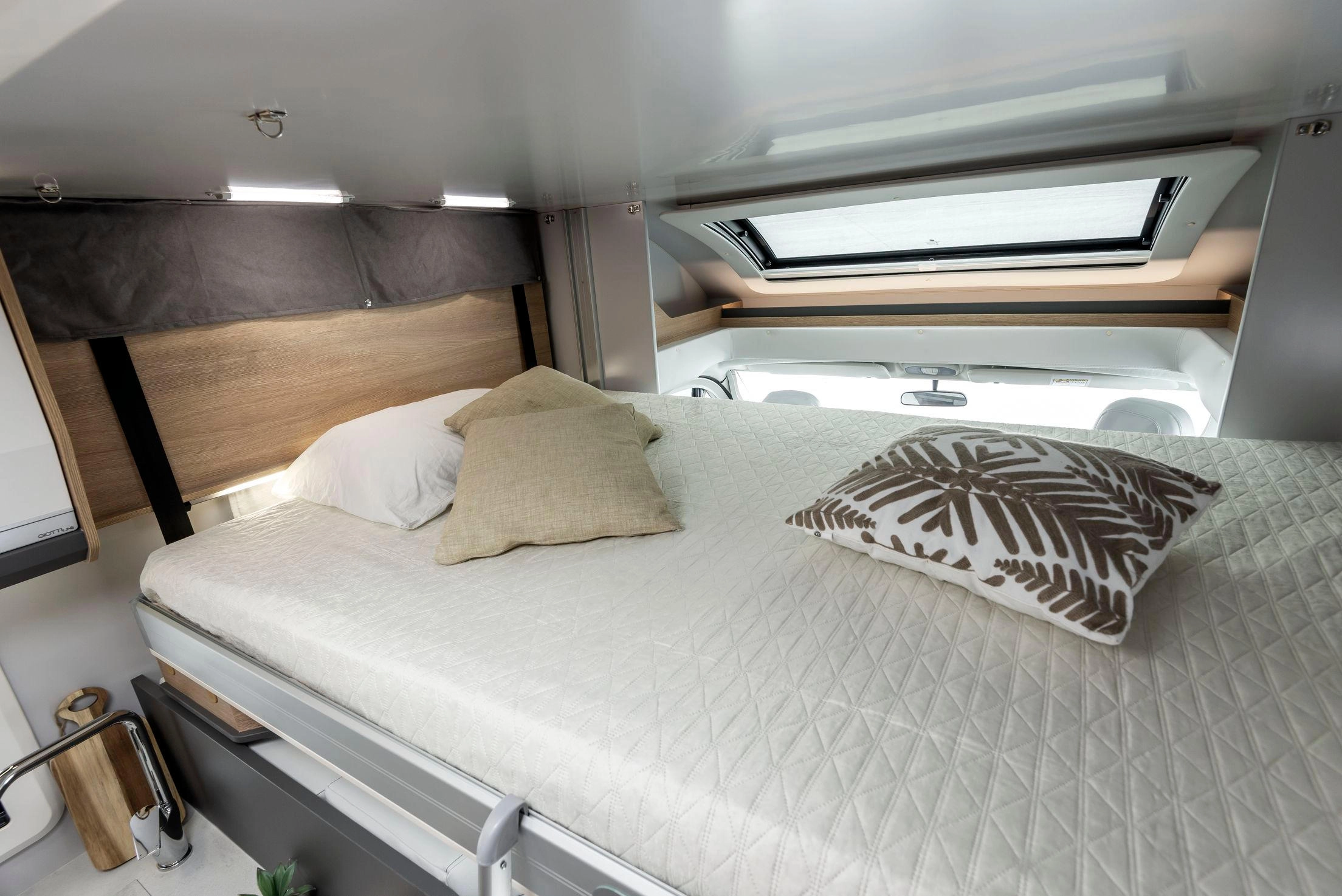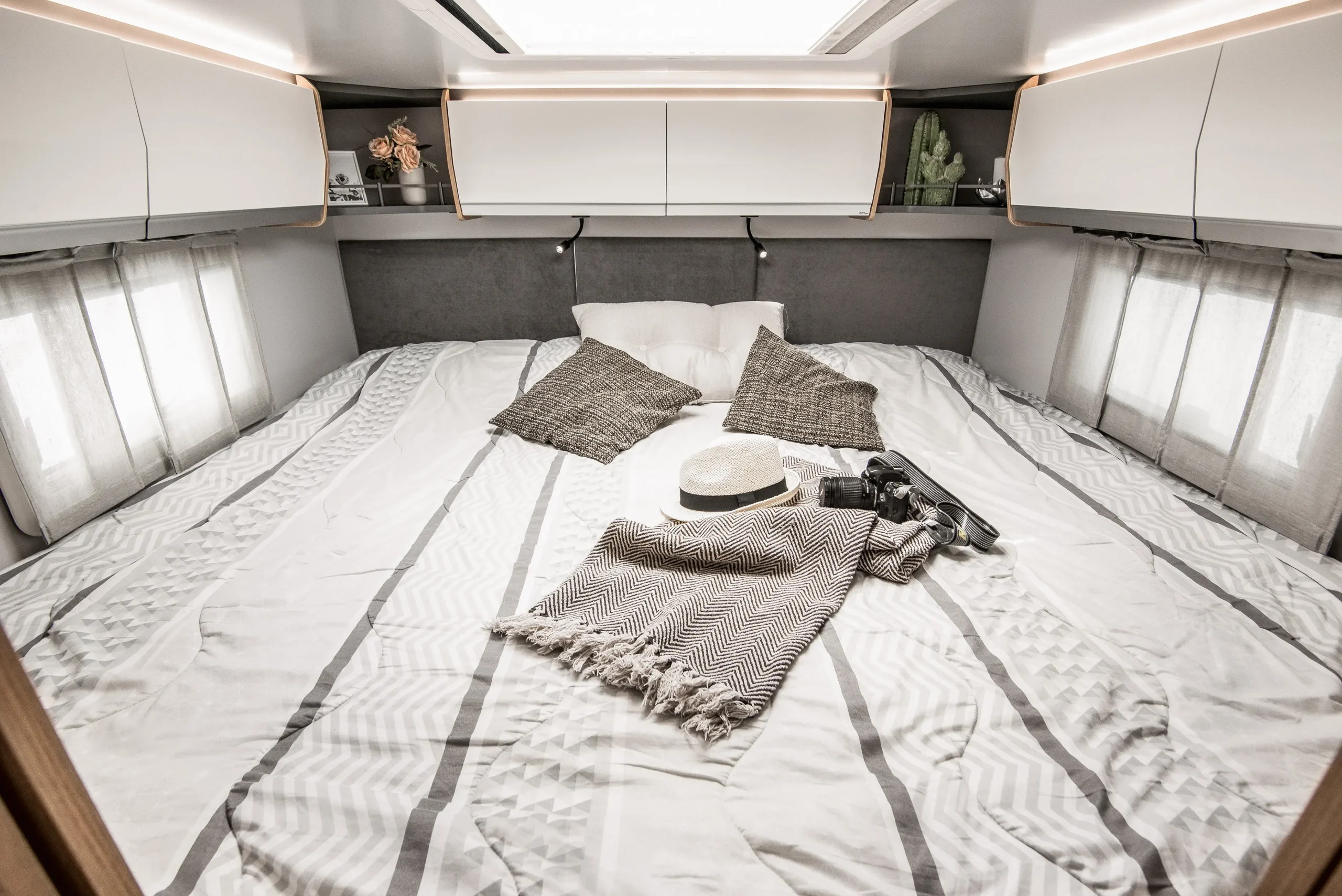 En su interior encontramos una cama central trasera y una cama basculante delantera, junto con una cocina completamente equipada, un baño con ducha independiente y un amplio salón con asientos enfrentados que crea un ambiente acogedor y social. Todo ello acompañado por una estética moderna y una excelente iluminación natural.
