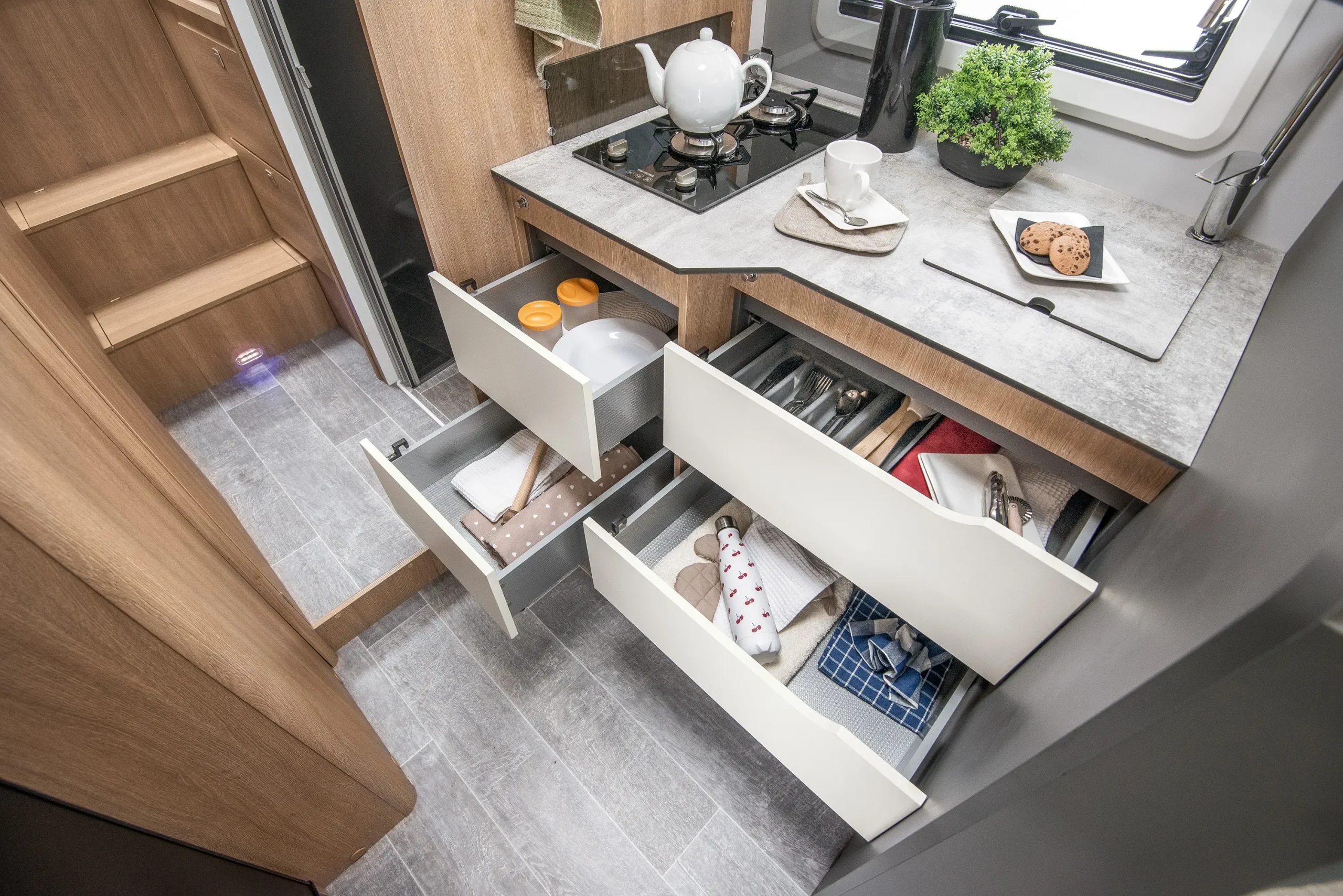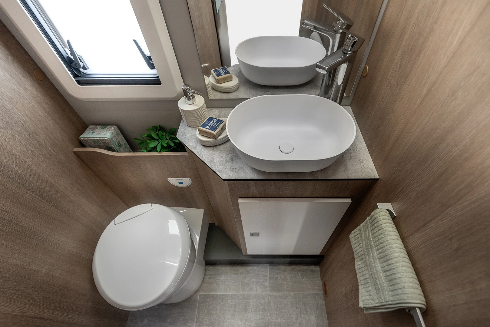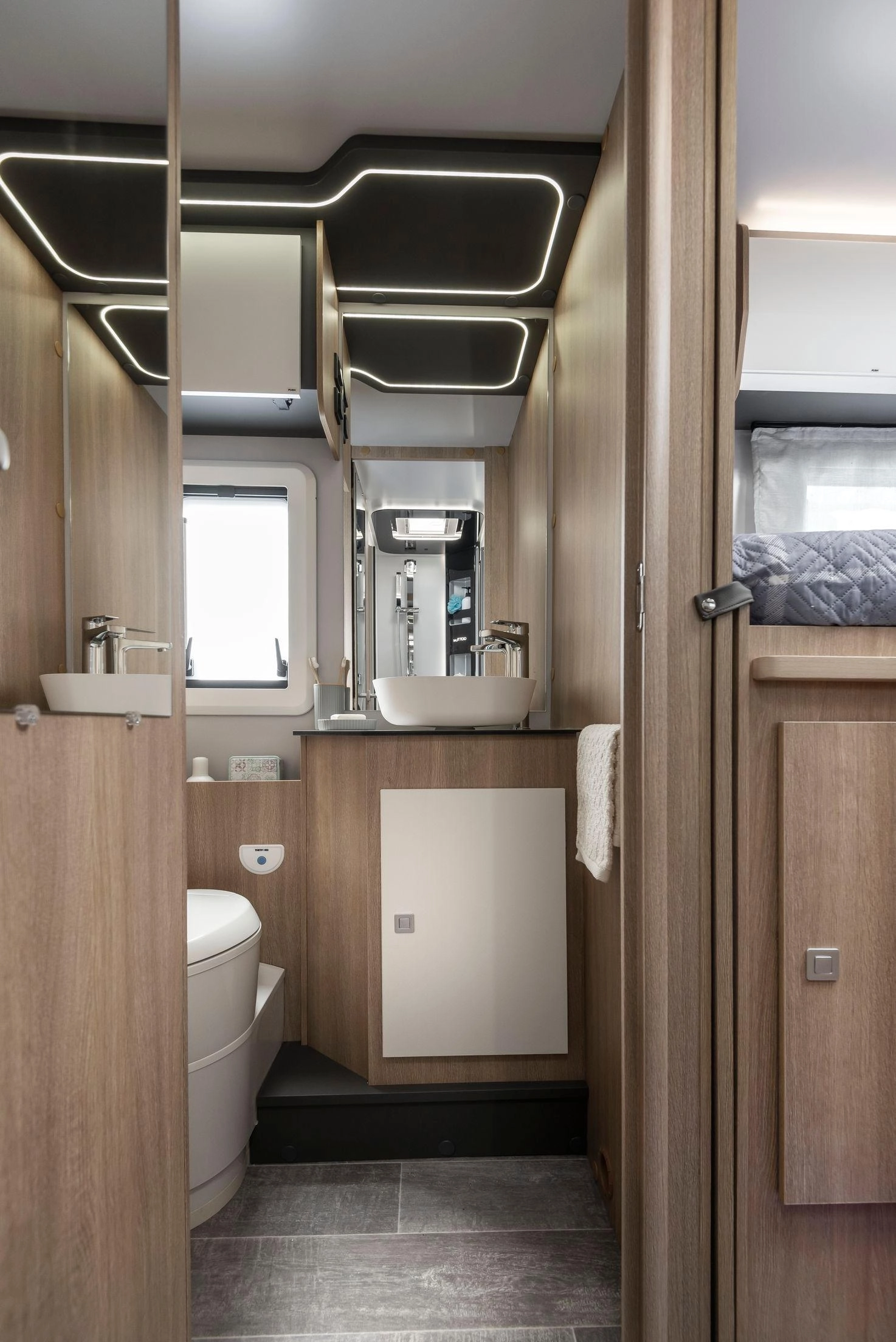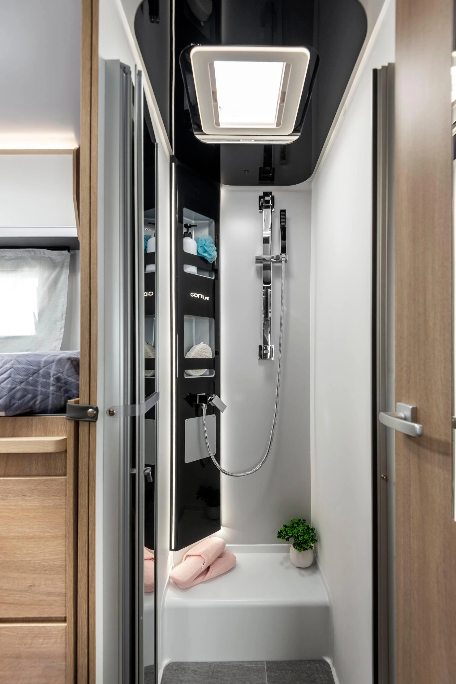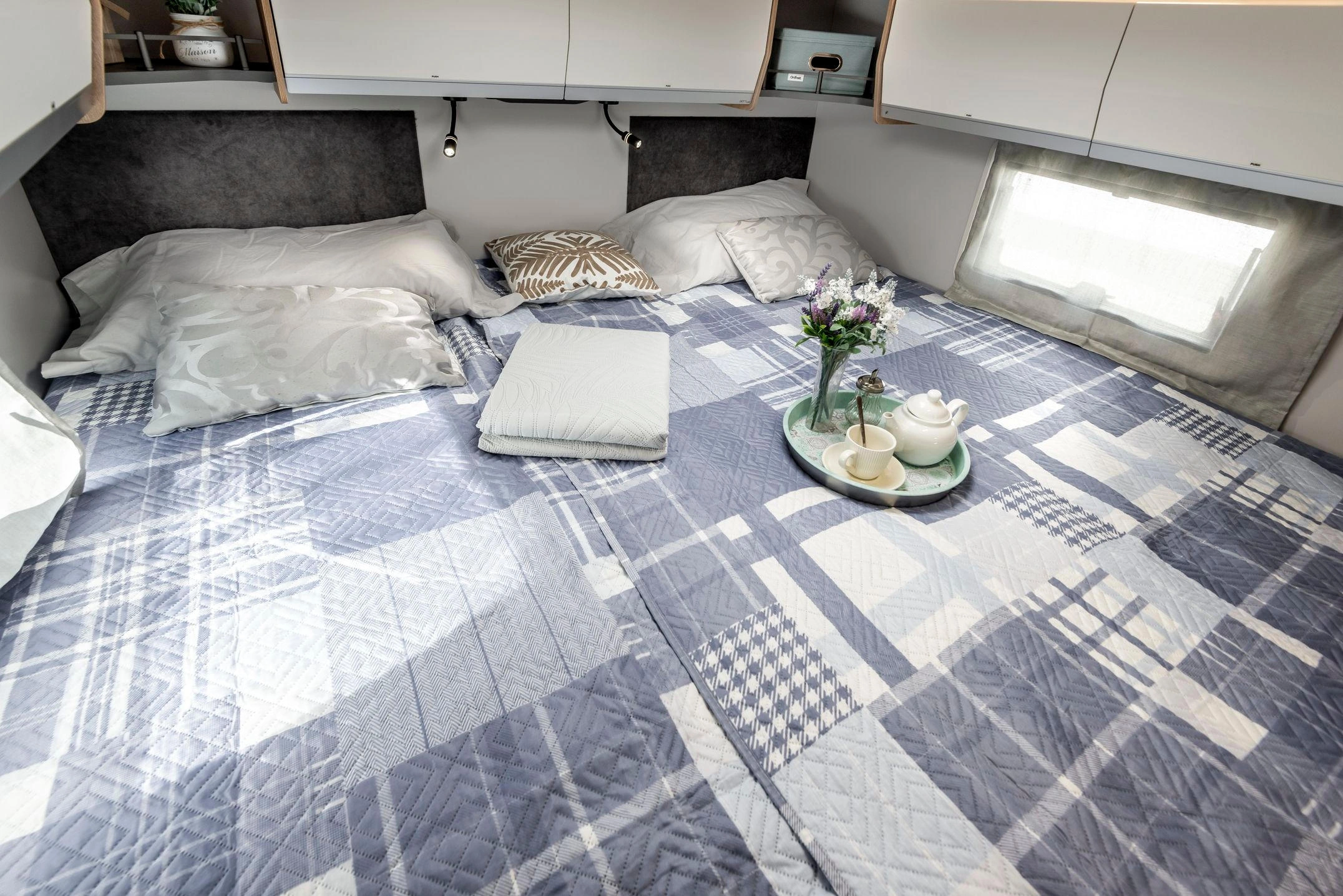 En su interior encontramos una cama central trasera y una cama basculante delantera, junto con una cocina completamente equipada, un baño con ducha independiente y un amplio salón con asientos enfrentados que crea un ambiente acogedor y social. Todo ello acompañado por una estética moderna y una excelente iluminación natural.