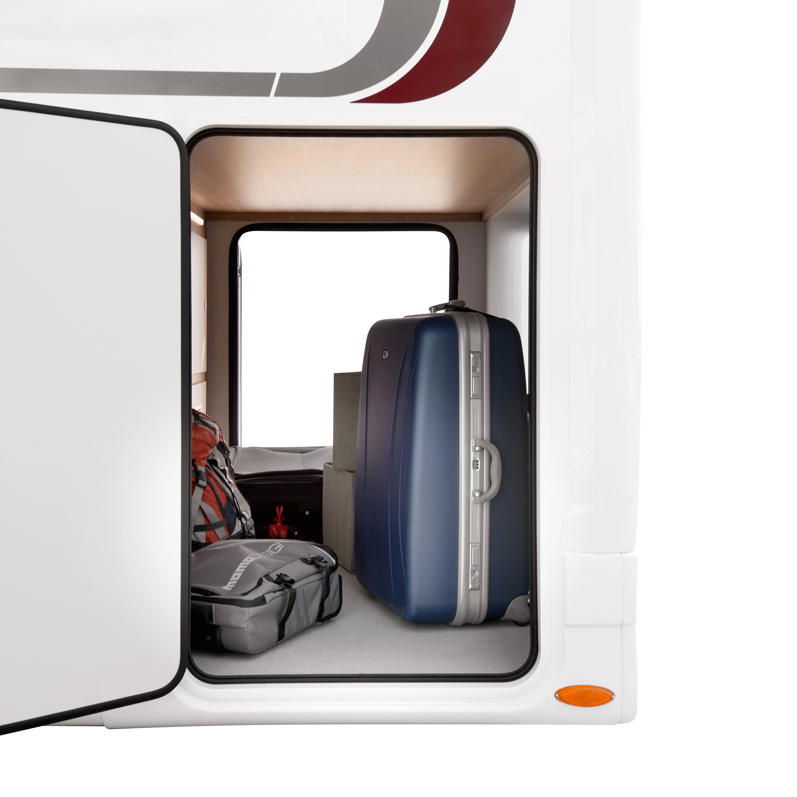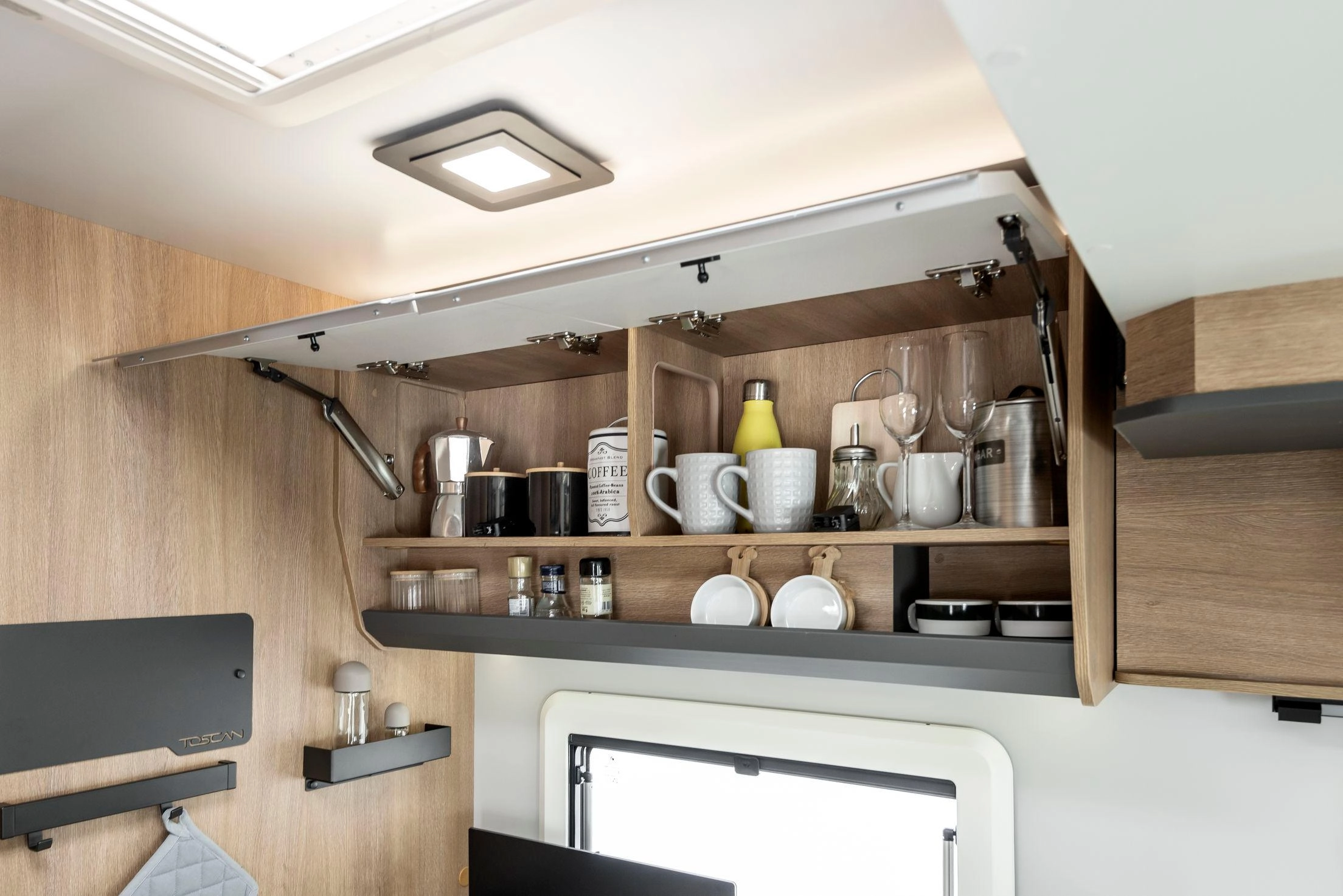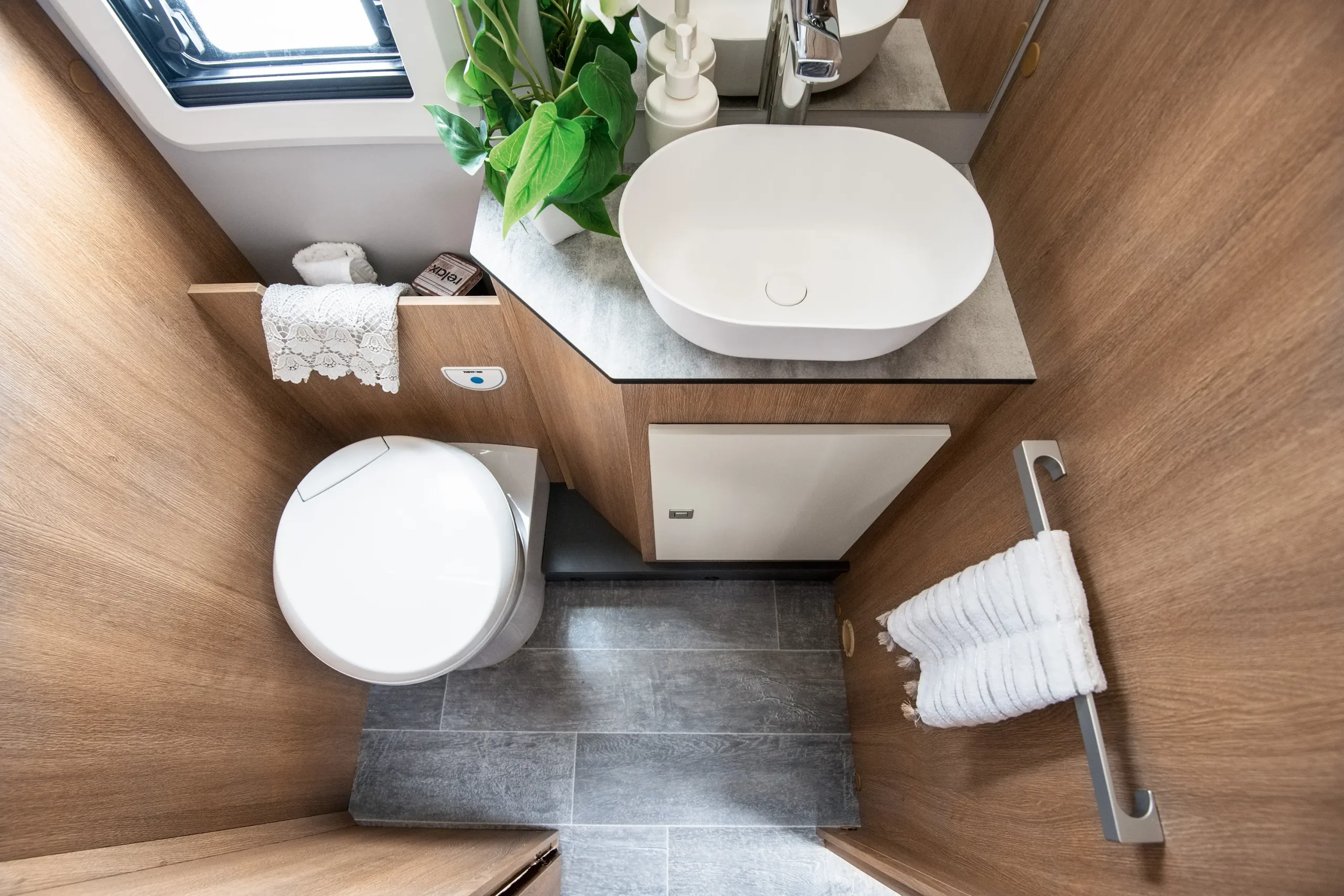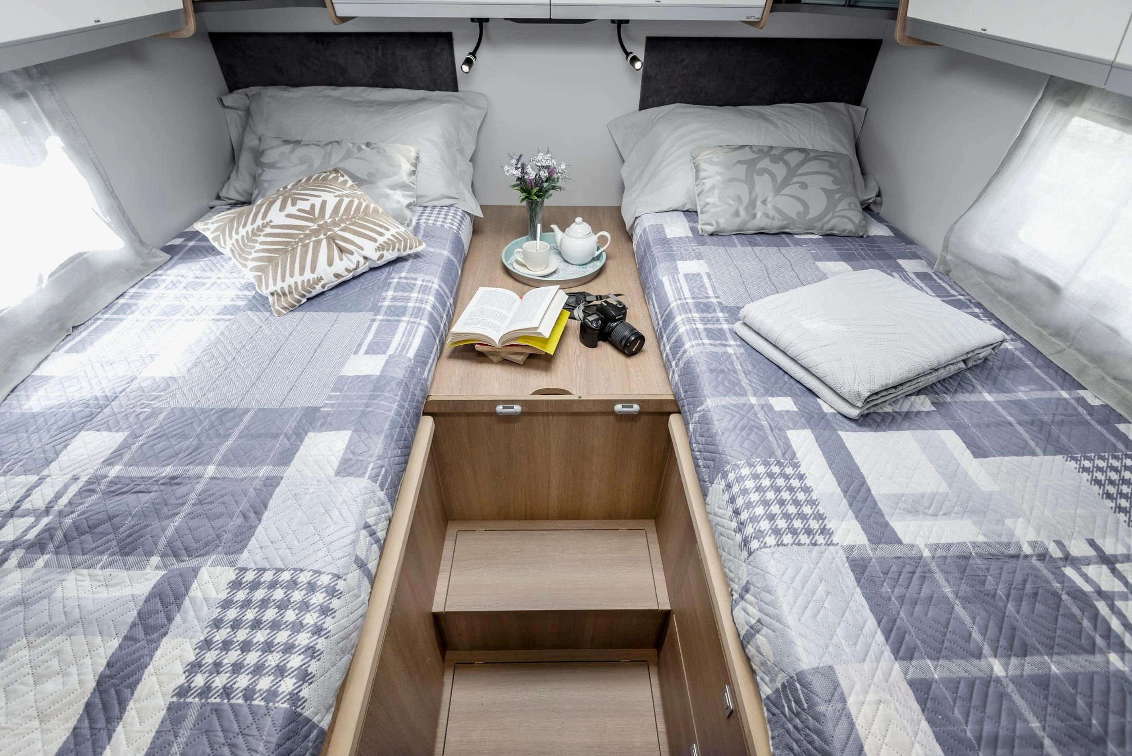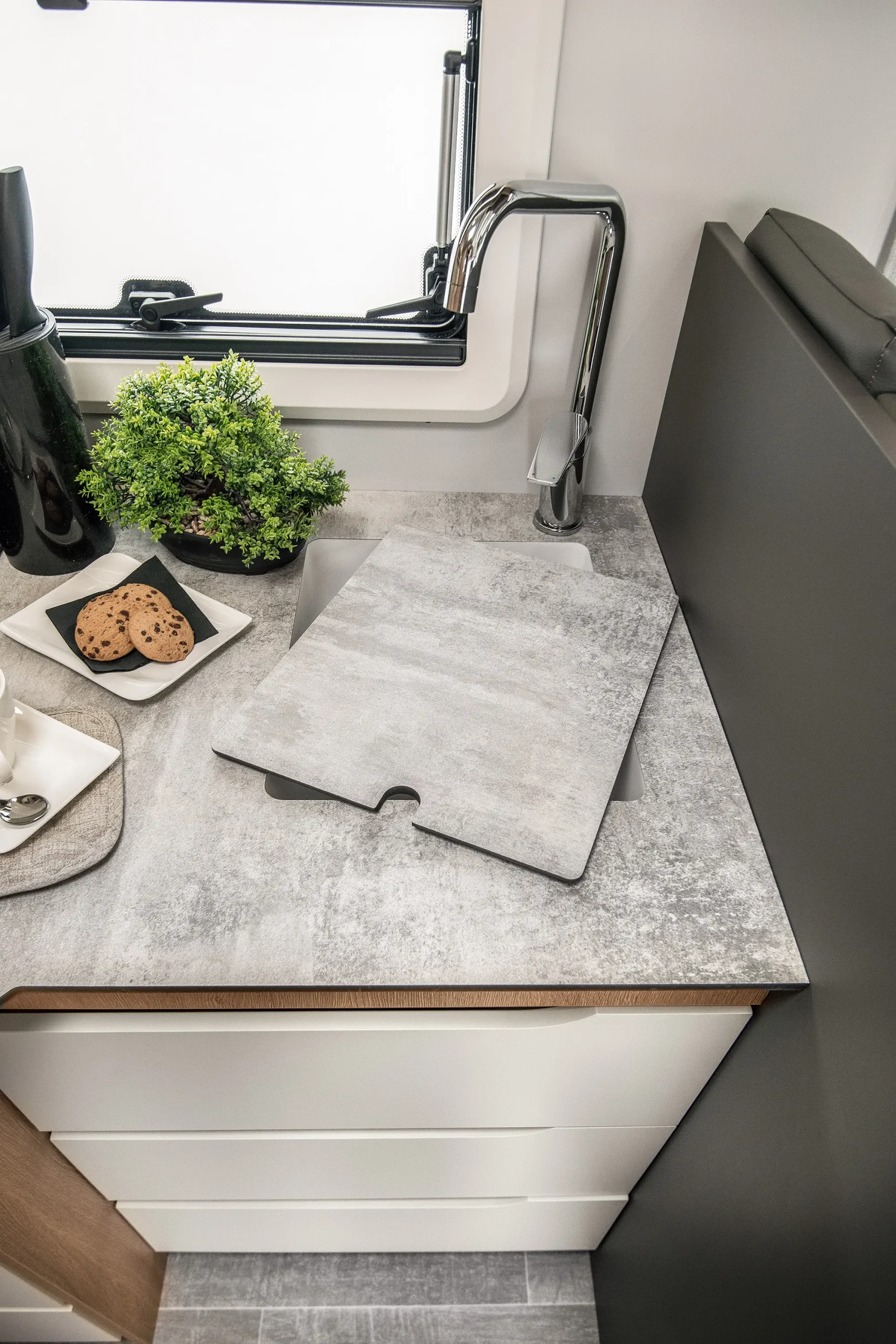 En su interior encontramos una cama central trasera y una cama basculante delantera, junto con una cocina completamente equipada, un baño con ducha independiente y un amplio salón con asientos enfrentados que crea un ambiente acogedor y social. Todo ello acompañado por una estética moderna y una excelente iluminación natural.