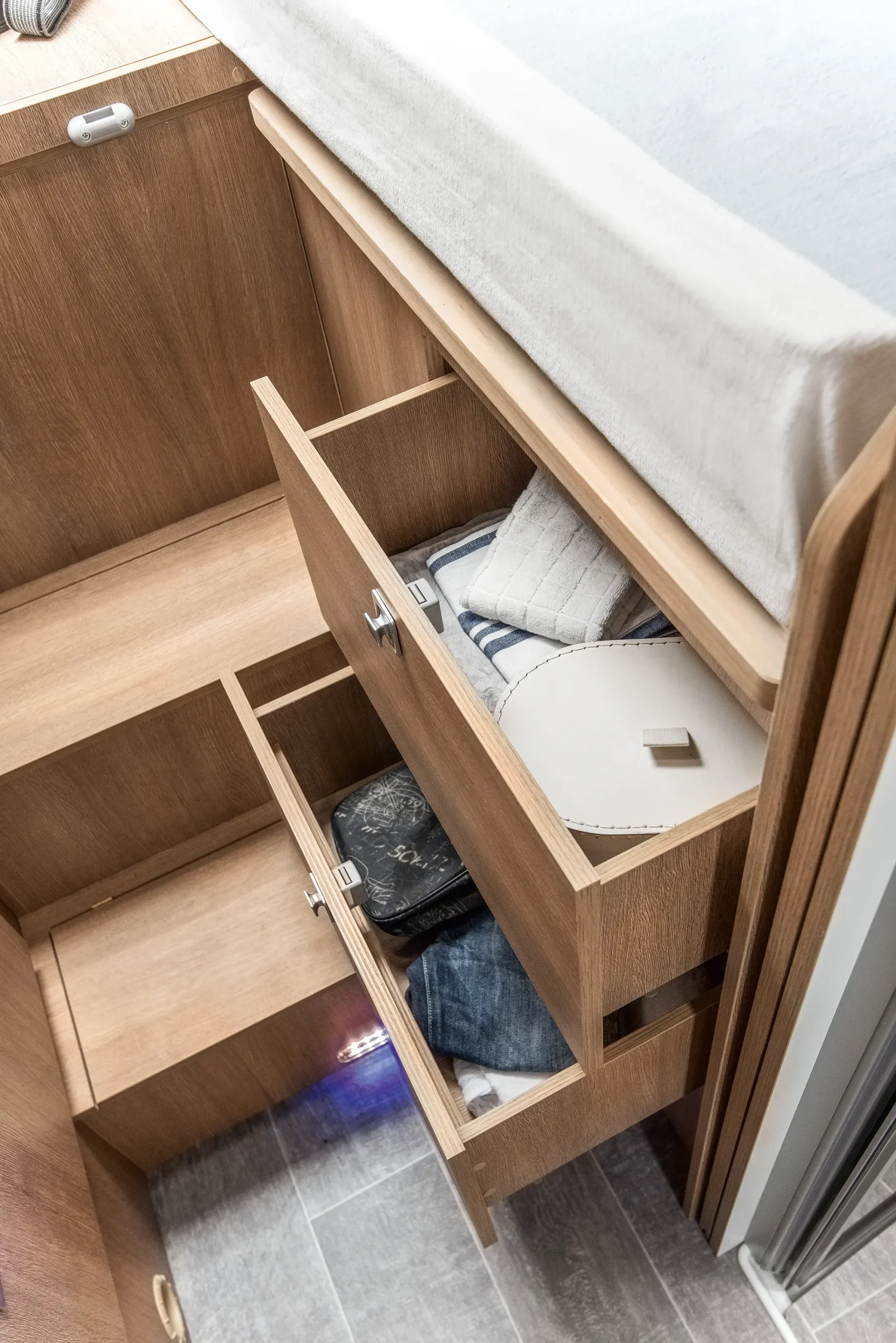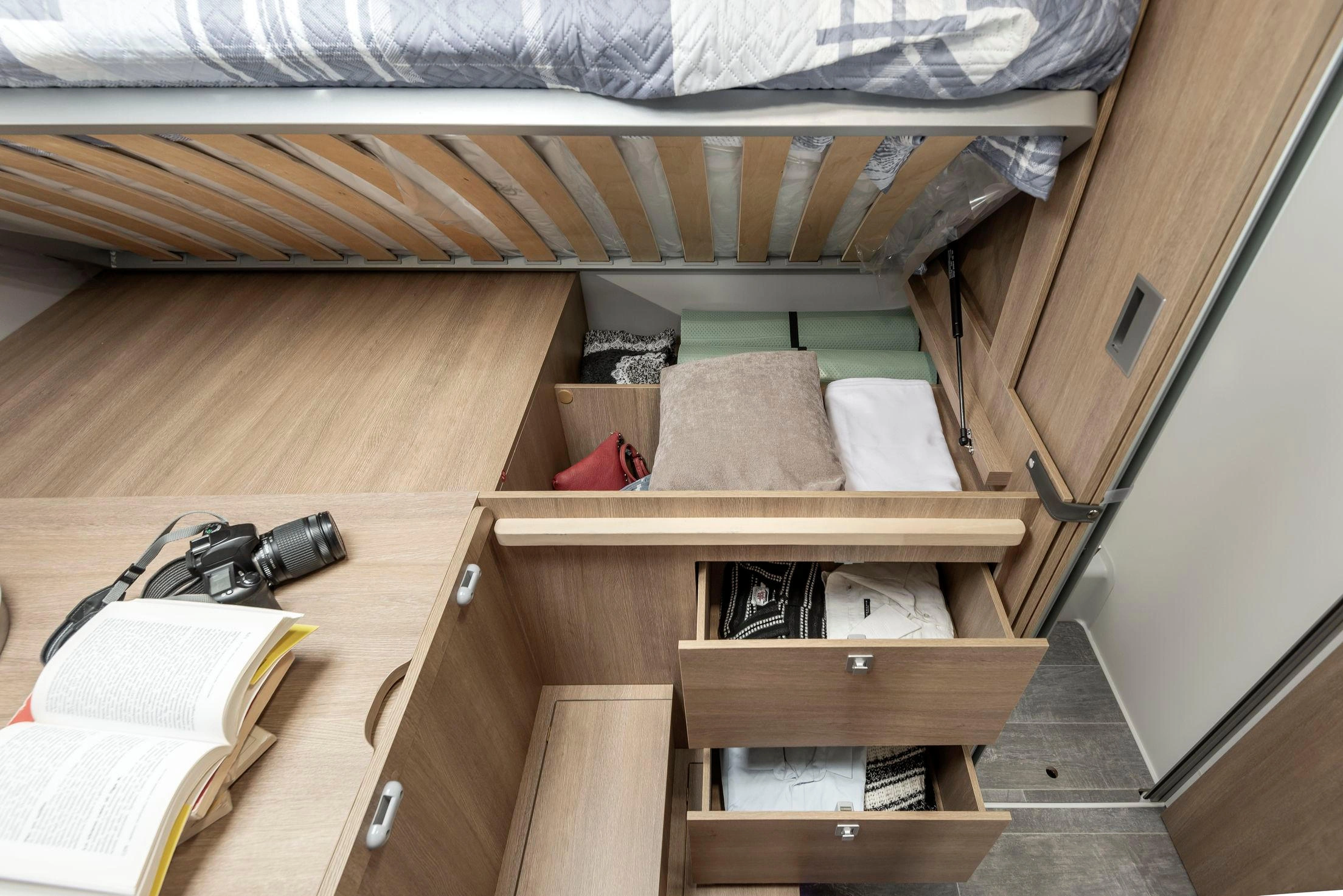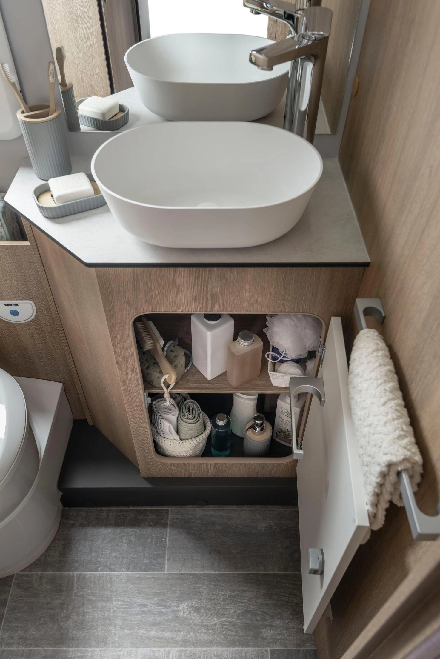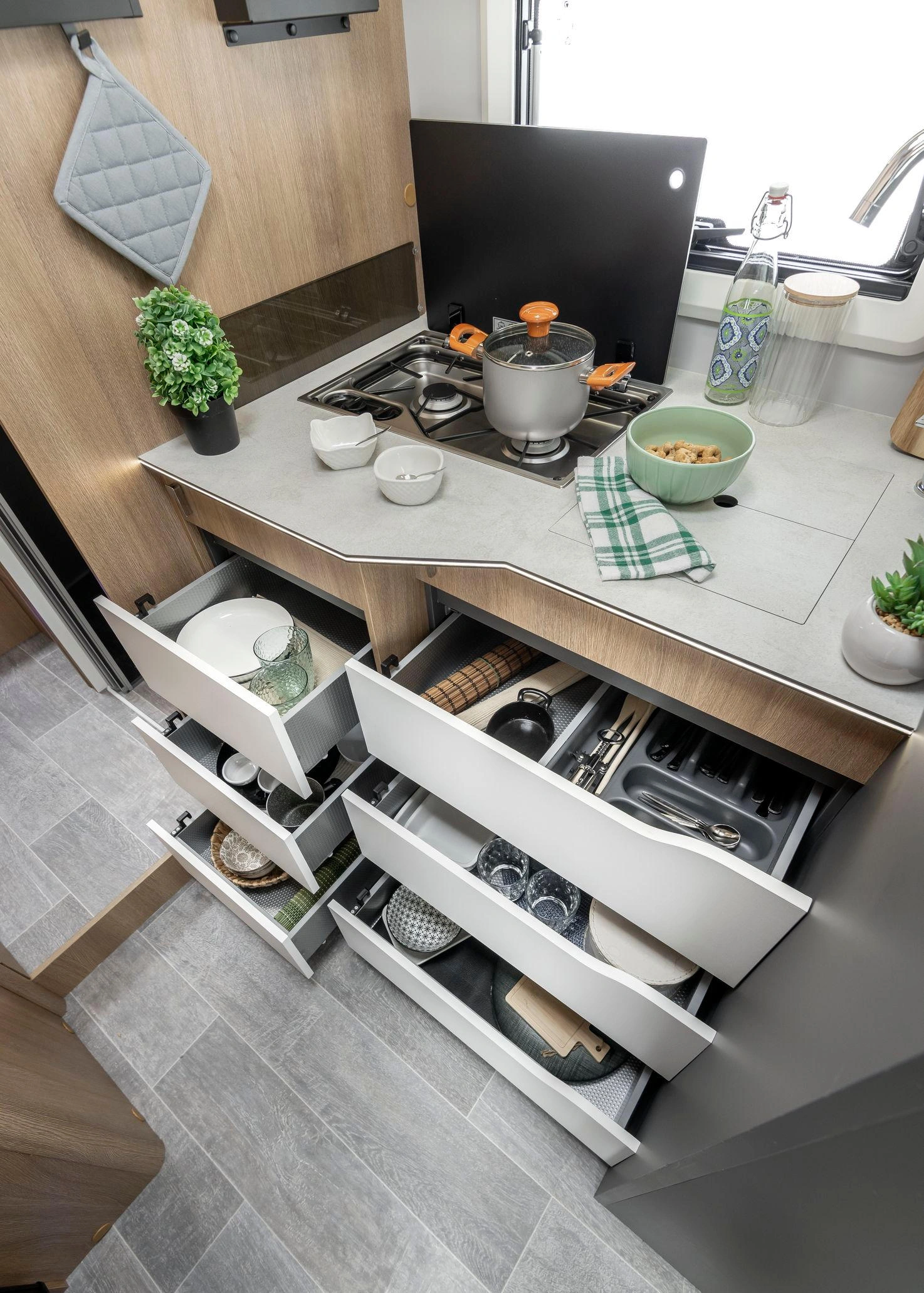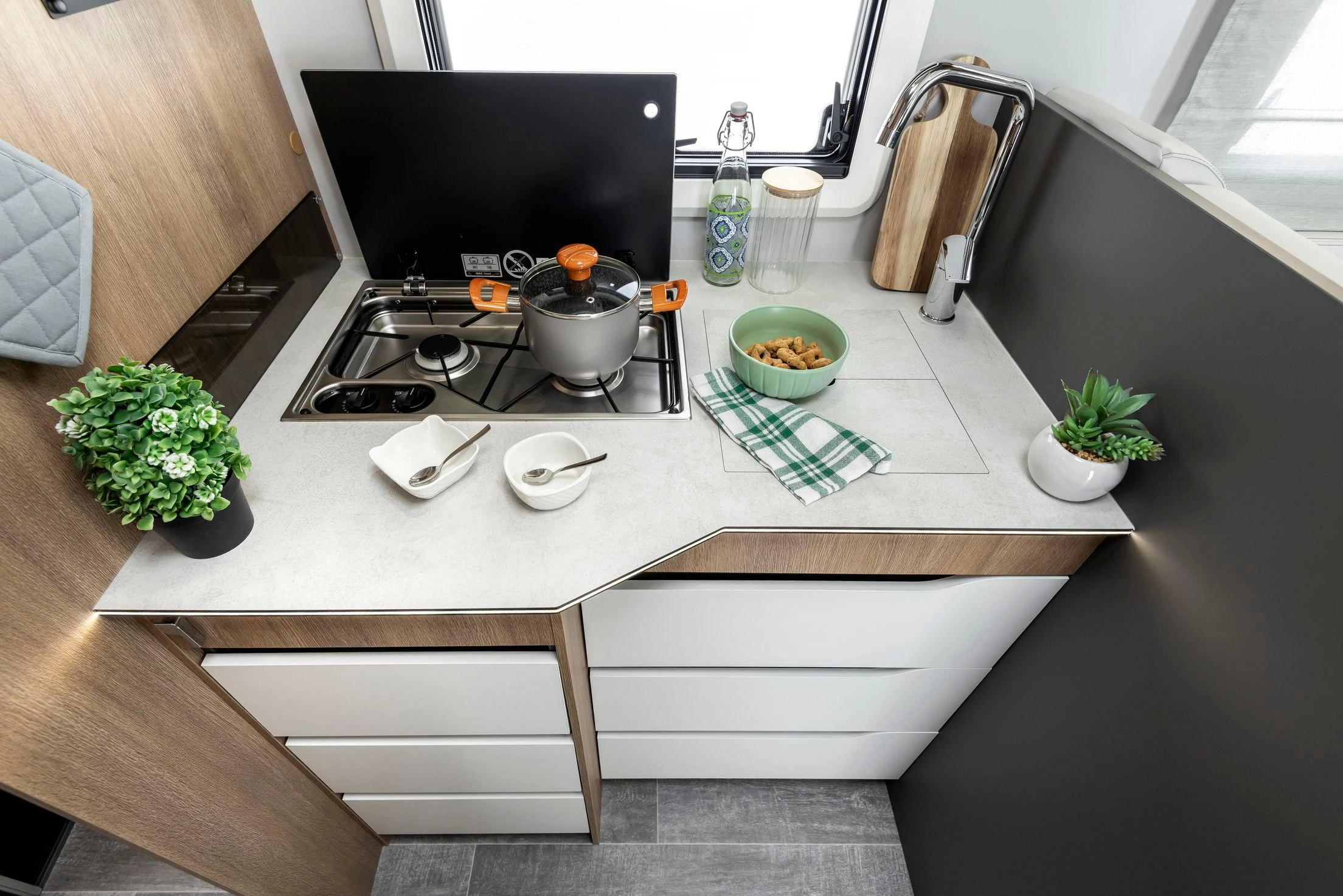 En su interior encontramos una cama central trasera y una cama basculante delantera, junto con una cocina completamente equipada, un baño con ducha independiente y un amplio salón con asientos enfrentados que crea un ambiente acogedor y social. Todo ello acompañado por una estética moderna y una excelente iluminación natural.