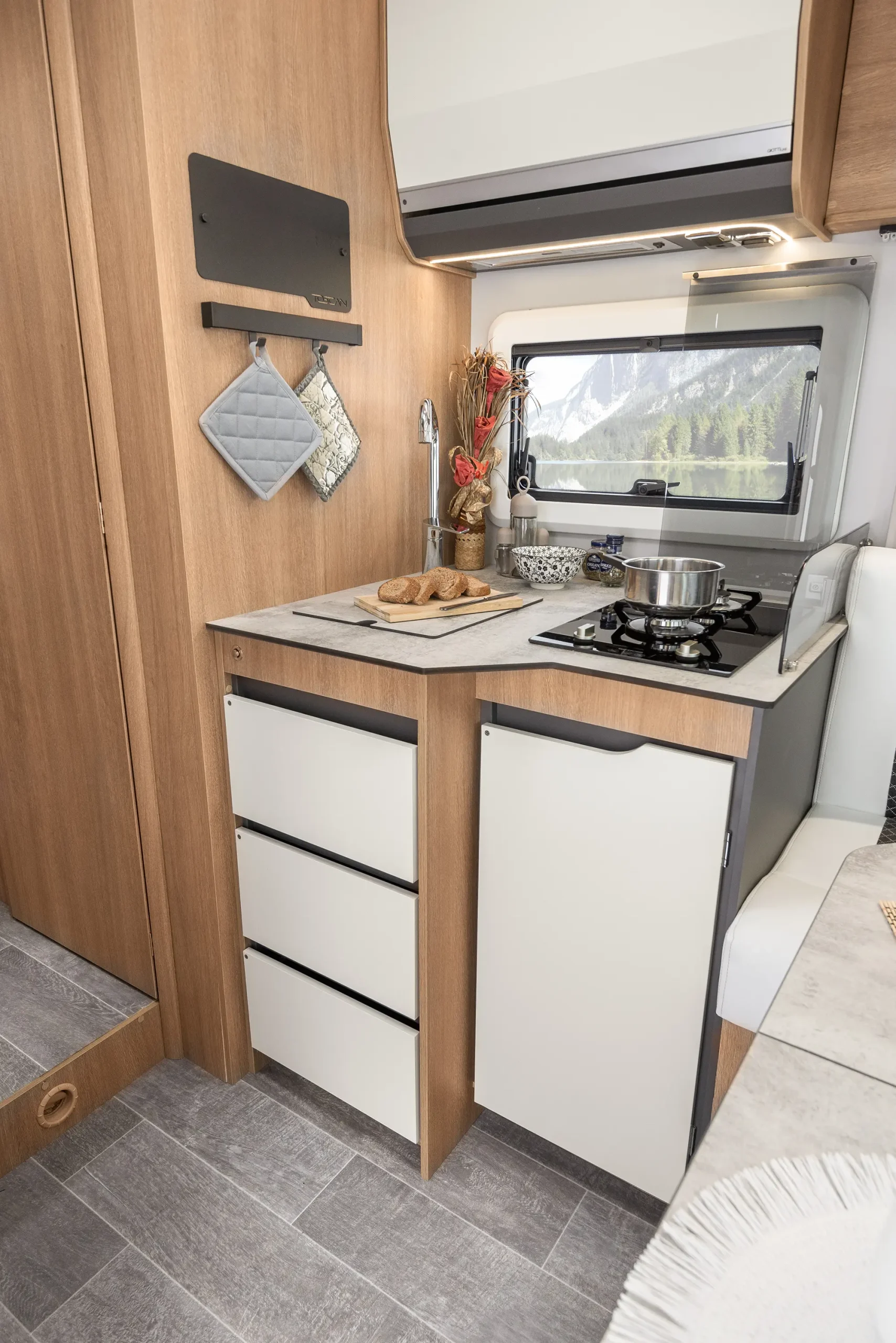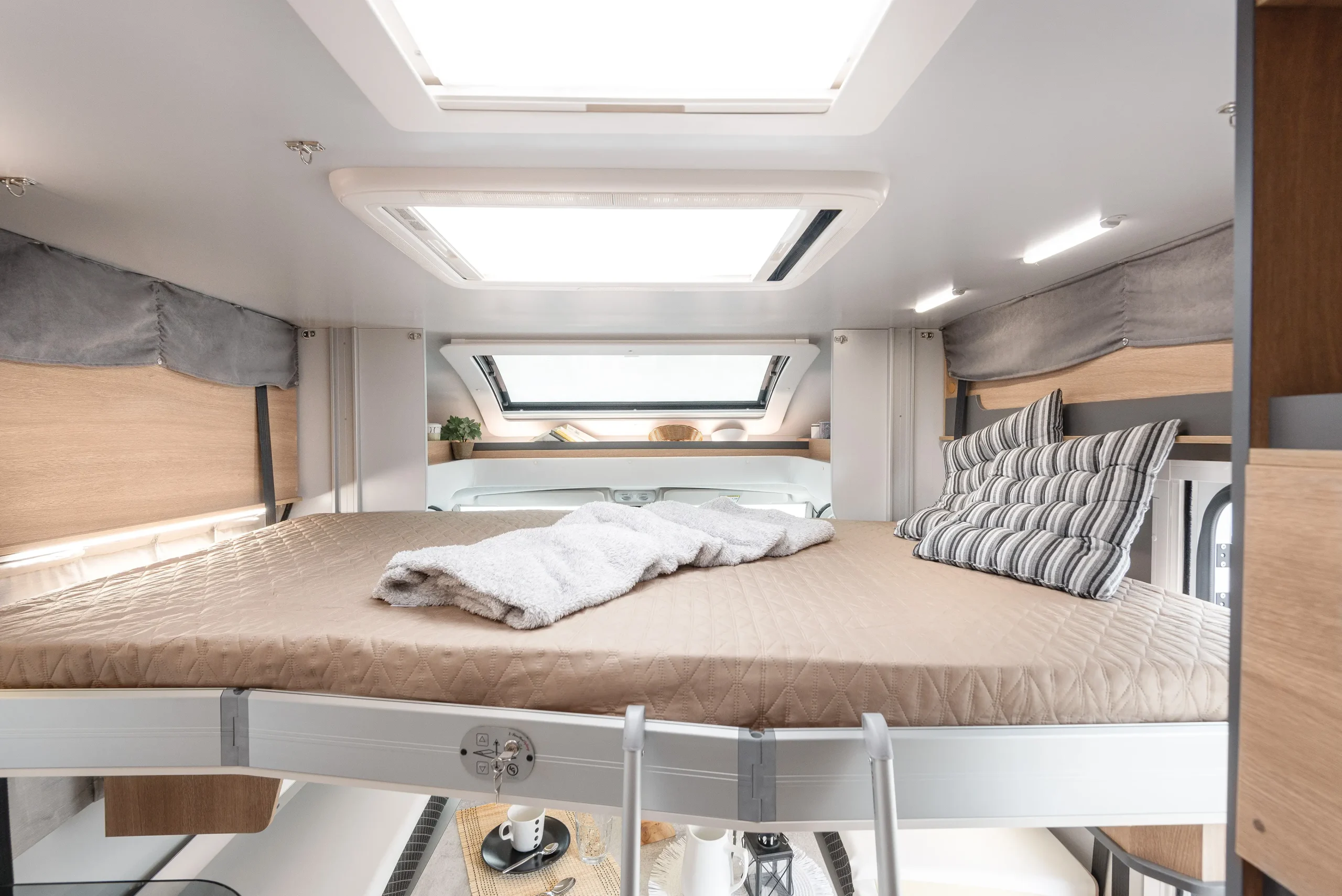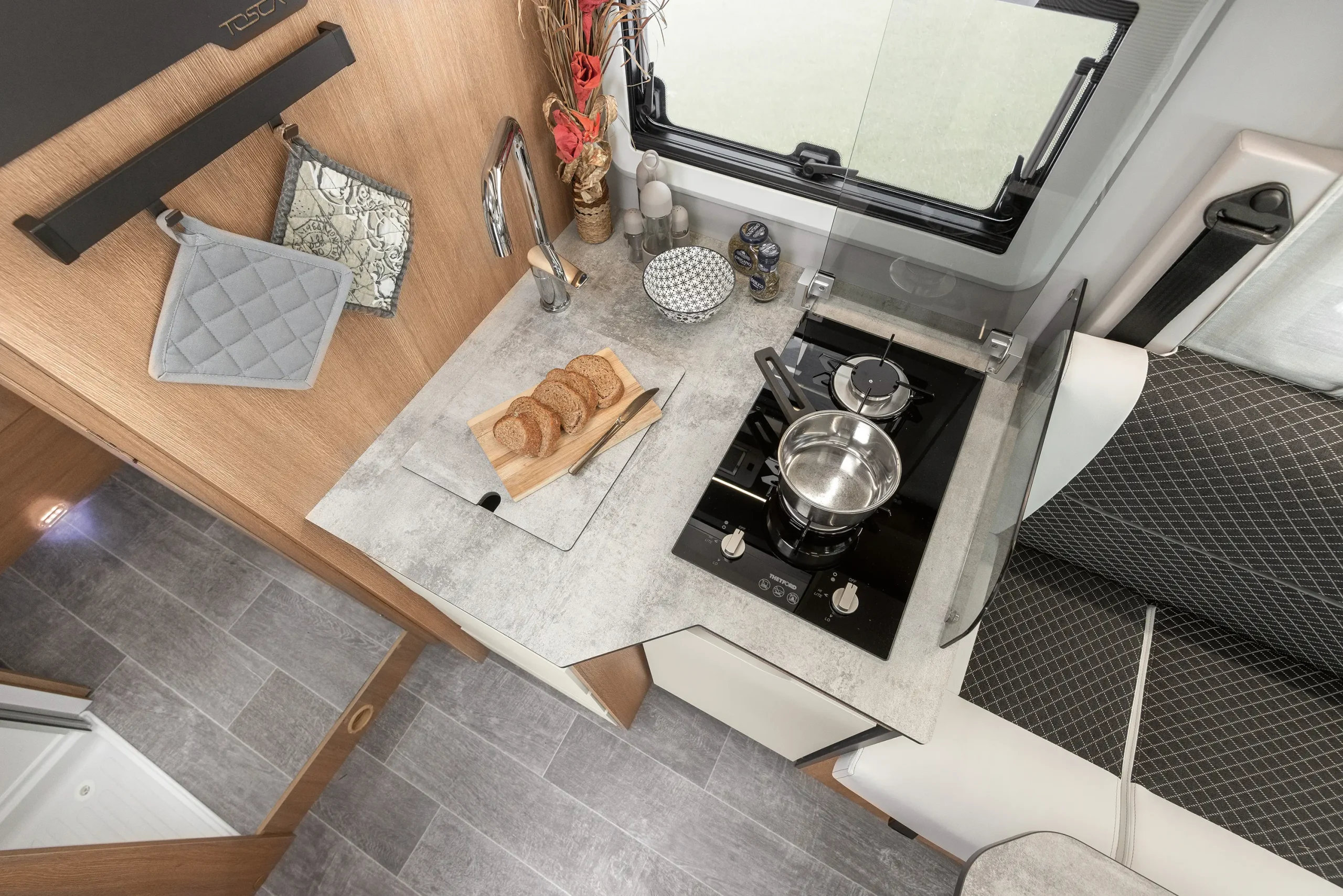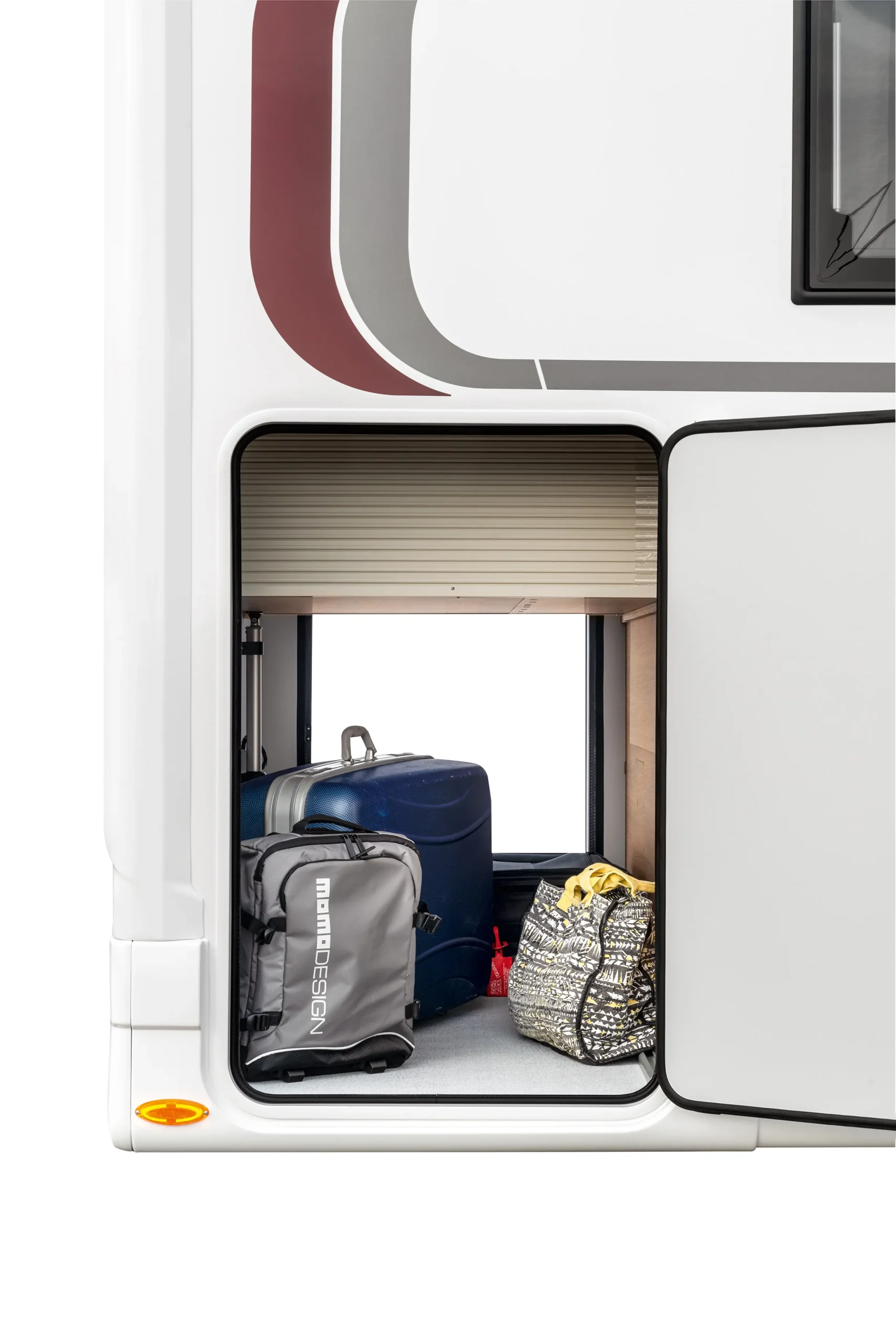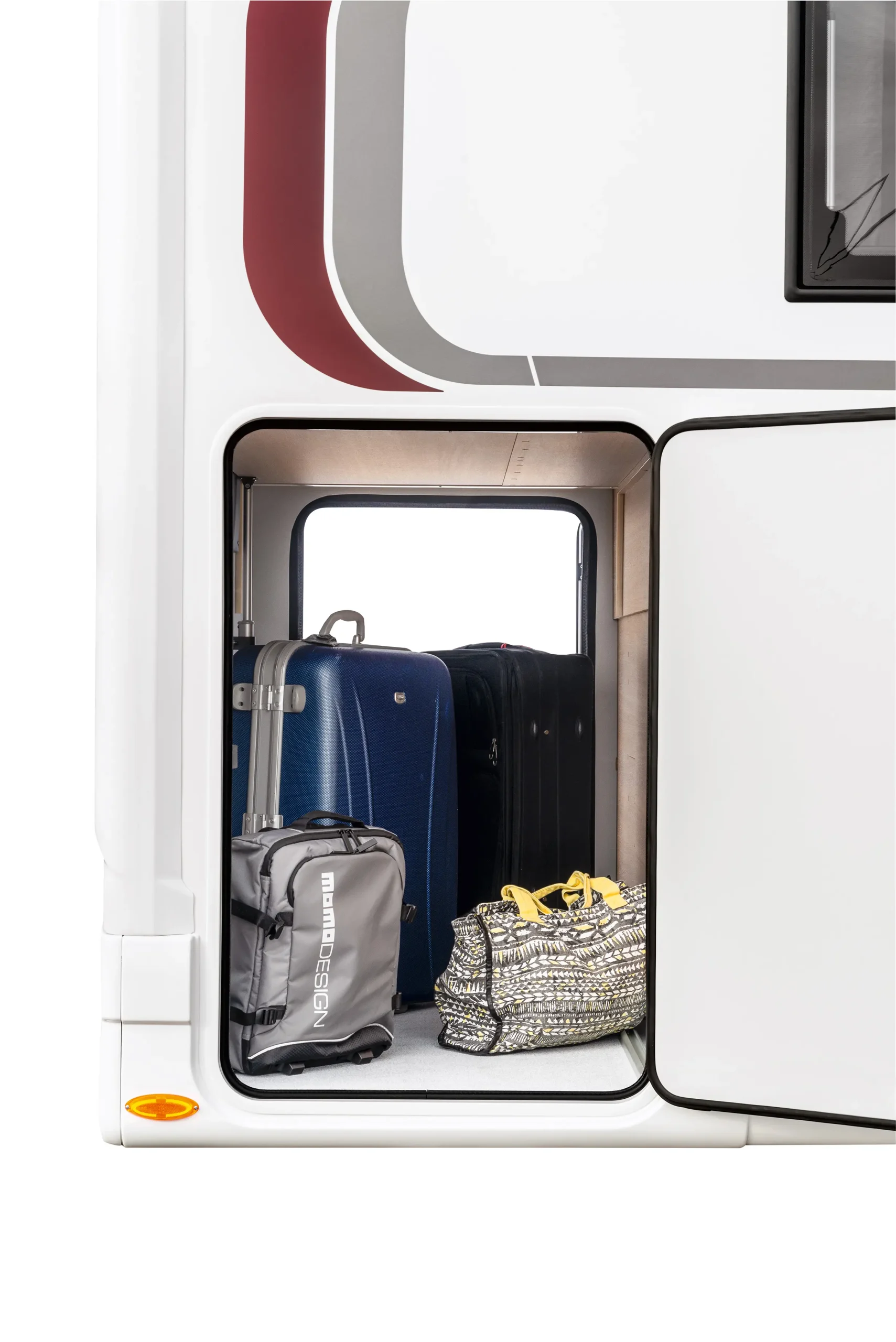 El interior de la Toscan 74NF sorprende por su amplitud y funcionalidad, con baño independiente con ducha separada, cocina de 2 fogones, nevera de 167 litros y una generosa capacidad de almacenamiento con cajones bajo la cama trasera. El garaje trasero regulable en altura alcanza hasta 117 cm, permitiendo transportar equipamiento voluminoso como bicicletas o material deportivo con total comodidad. La iluminación LED, calefacción Truma Combi y los depósitos de agua de 100 litros garantizan autonomía en cualquier época del año.
