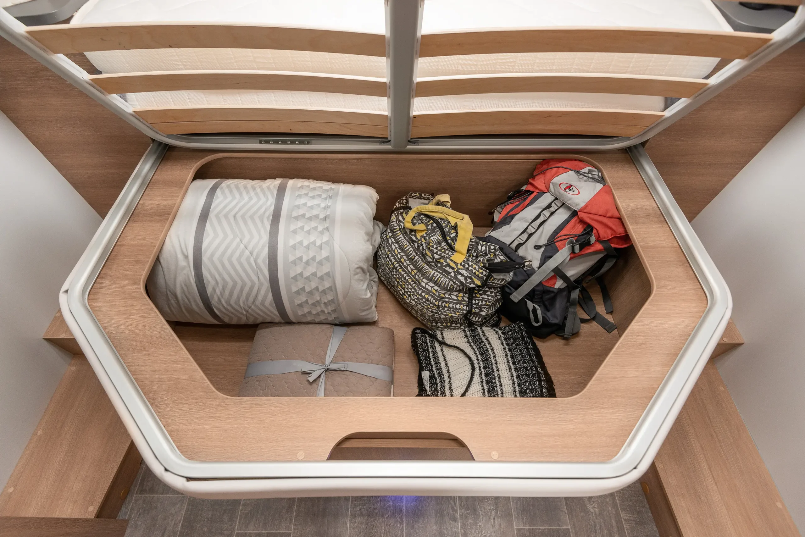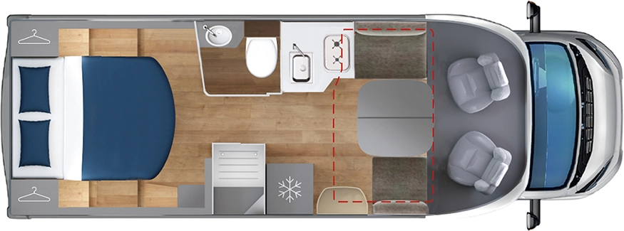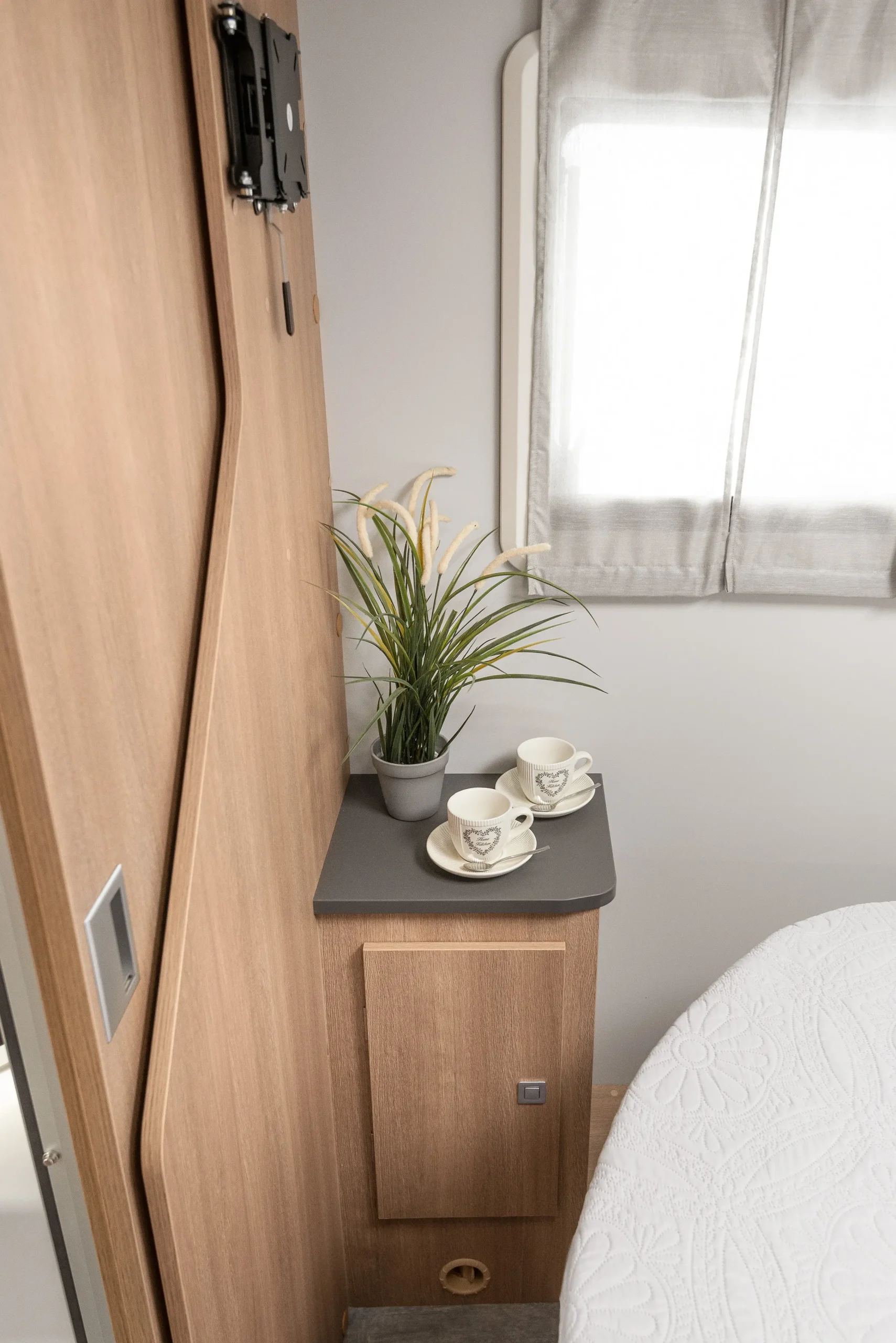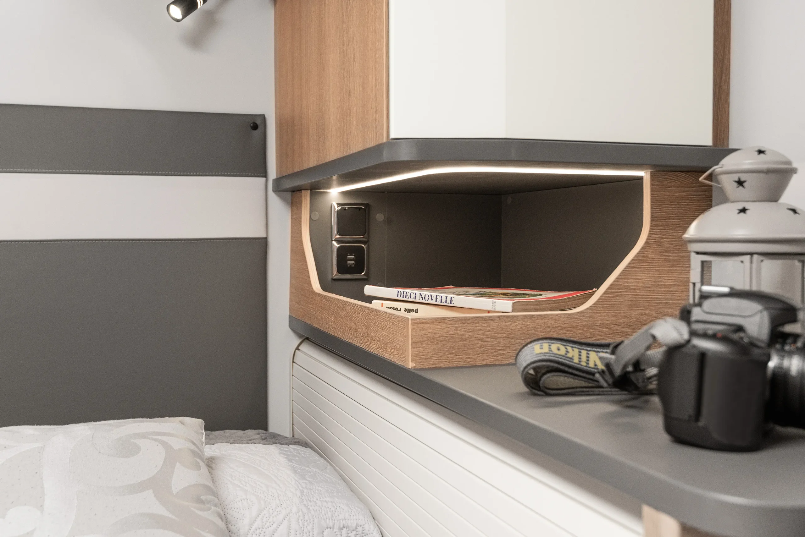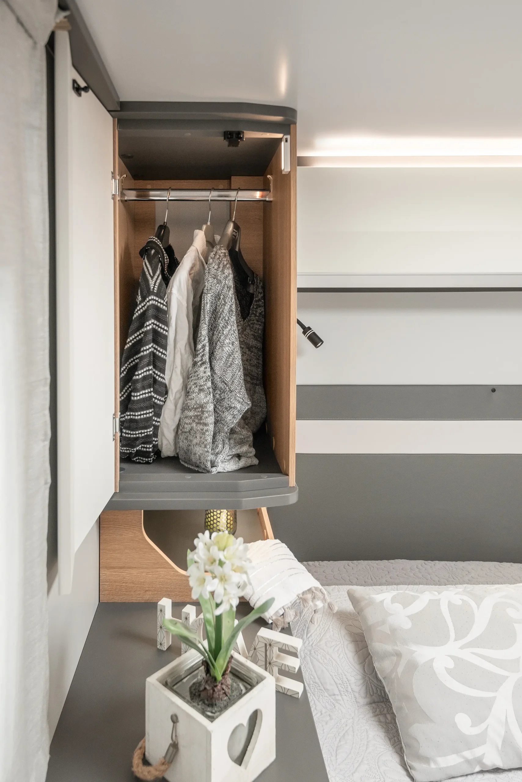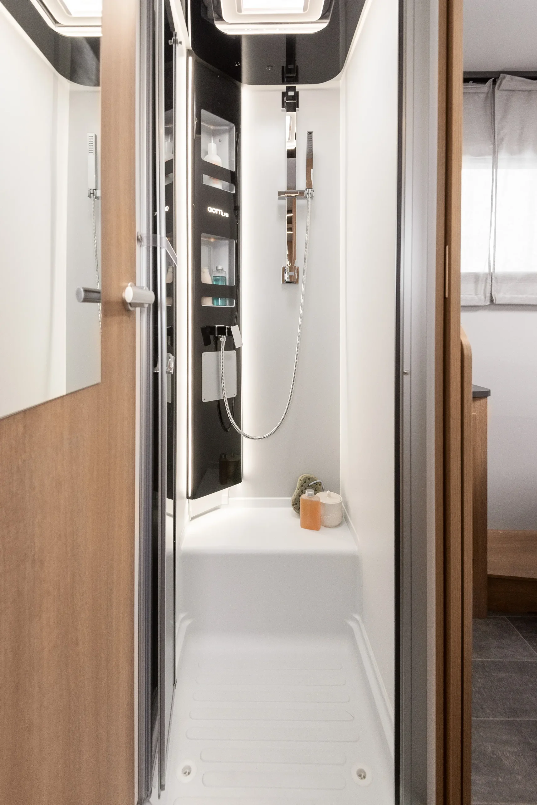 El interior de la Toscan 74NF sorprende por su amplitud y funcionalidad, con baño independiente con ducha separada, cocina de 2 fogones, nevera de 167 litros y una generosa capacidad de almacenamiento con cajones bajo la cama trasera. El garaje trasero regulable en altura alcanza hasta 117 cm, permitiendo transportar equipamiento voluminoso como bicicletas o material deportivo con total comodidad. La iluminación LED, calefacción Truma Combi y los depósitos de agua de 100 litros garantizan autonomía en cualquier época del año.