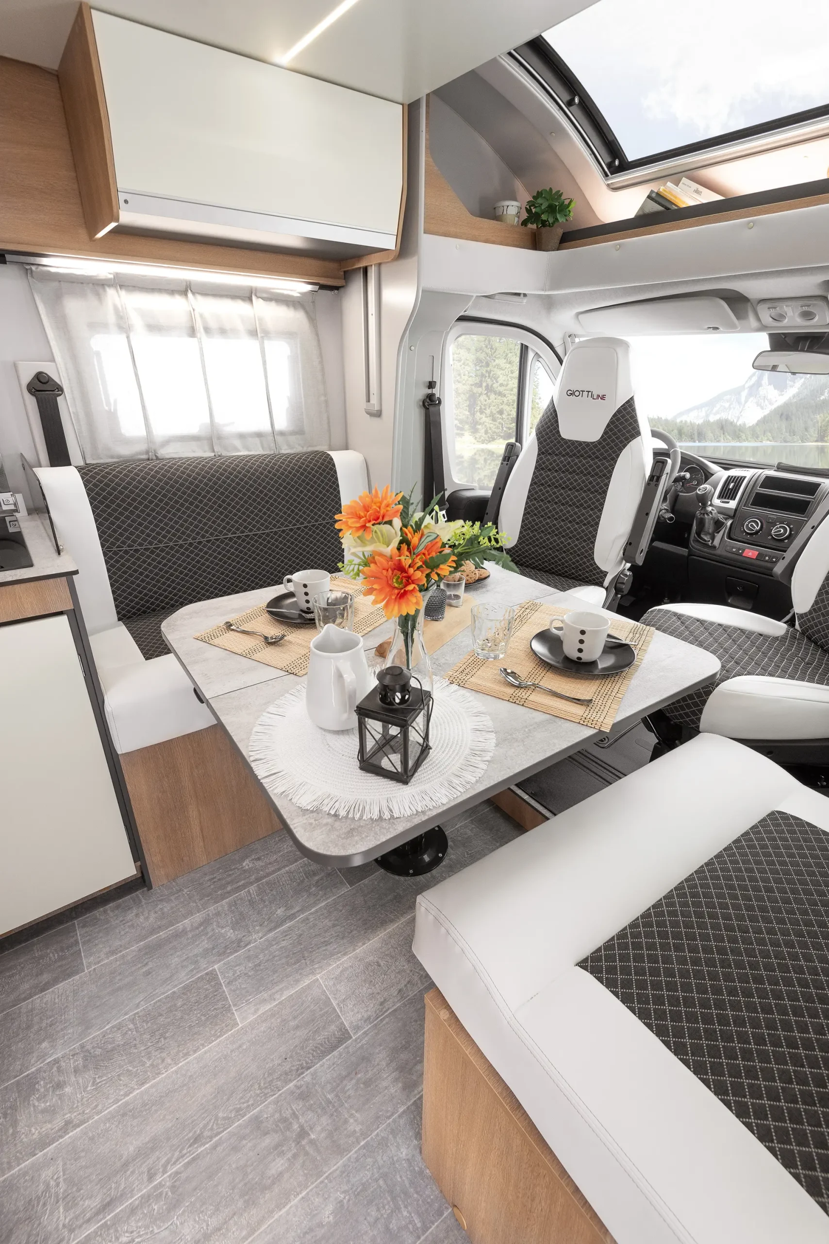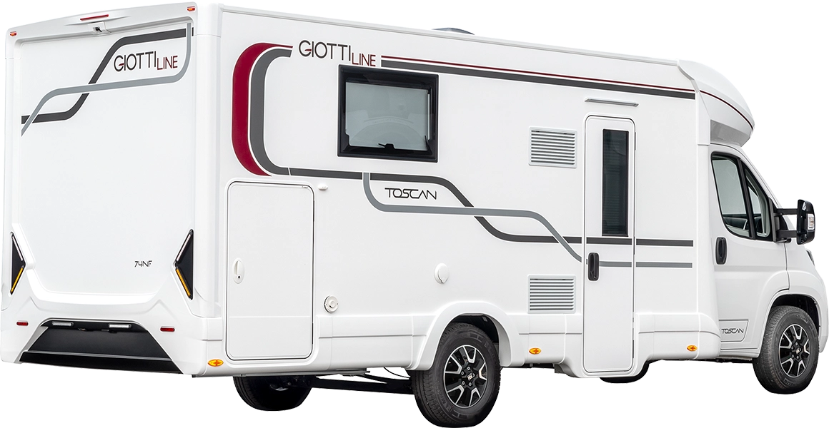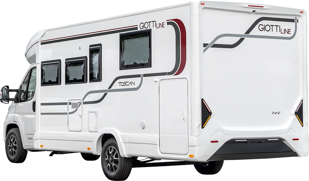 La Giottiline Toscan 74NF es una autocaravana perfilada de 7,4 metros con cama isla trasera y salón cara a cara, perfecta para parejas que buscan lujo, espacio y confort en ruta.