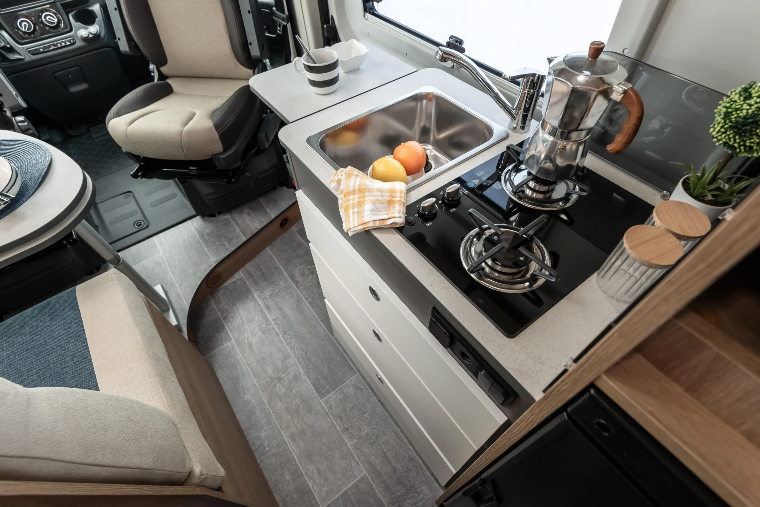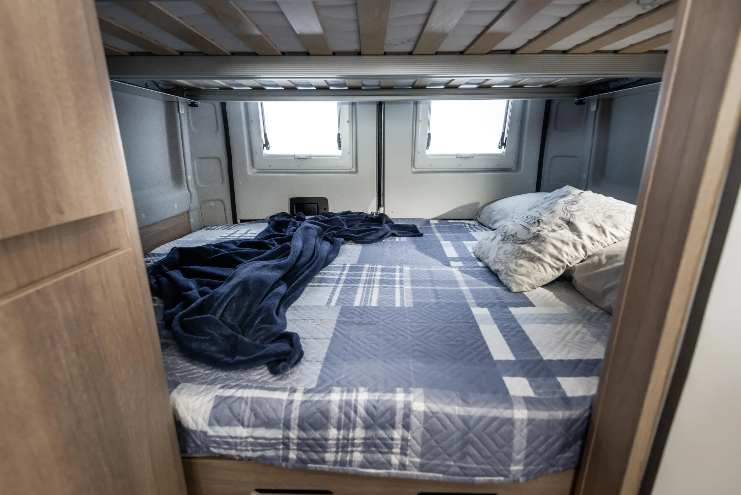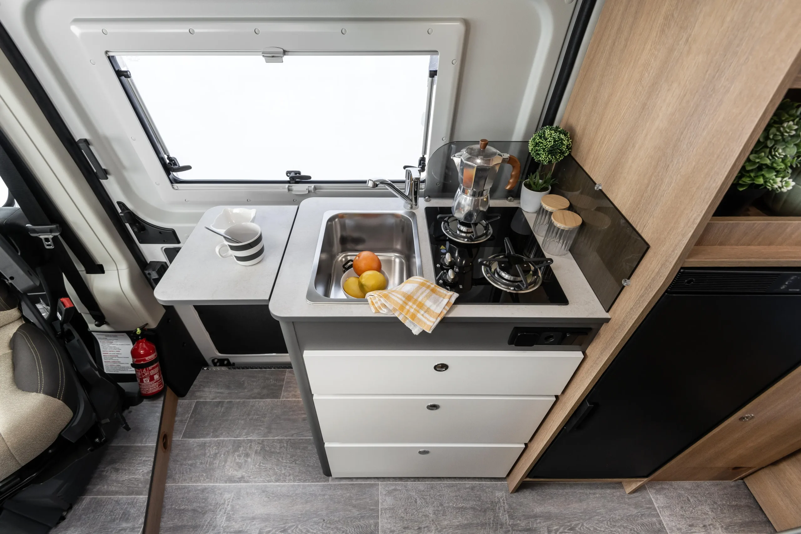 En su interior se destacan las literas dobles traseras (133 × 186 cm la inferior / 124 × 186 cm la superior), una cocina equipada con encimera amplia y nevera de compresor de 90 L, además de un baño con ducha integrada tipo “VARIO” y sistema de calefacción Truma Combi C 4000. La zona de día es luminosa y bien organizada, con espacio de almacenamiento pensado para equipaje o material deportivo, lo que le aporta al vehículo un perfil versátil tanto para viajes activos como para convivir cómodamente a bordo.