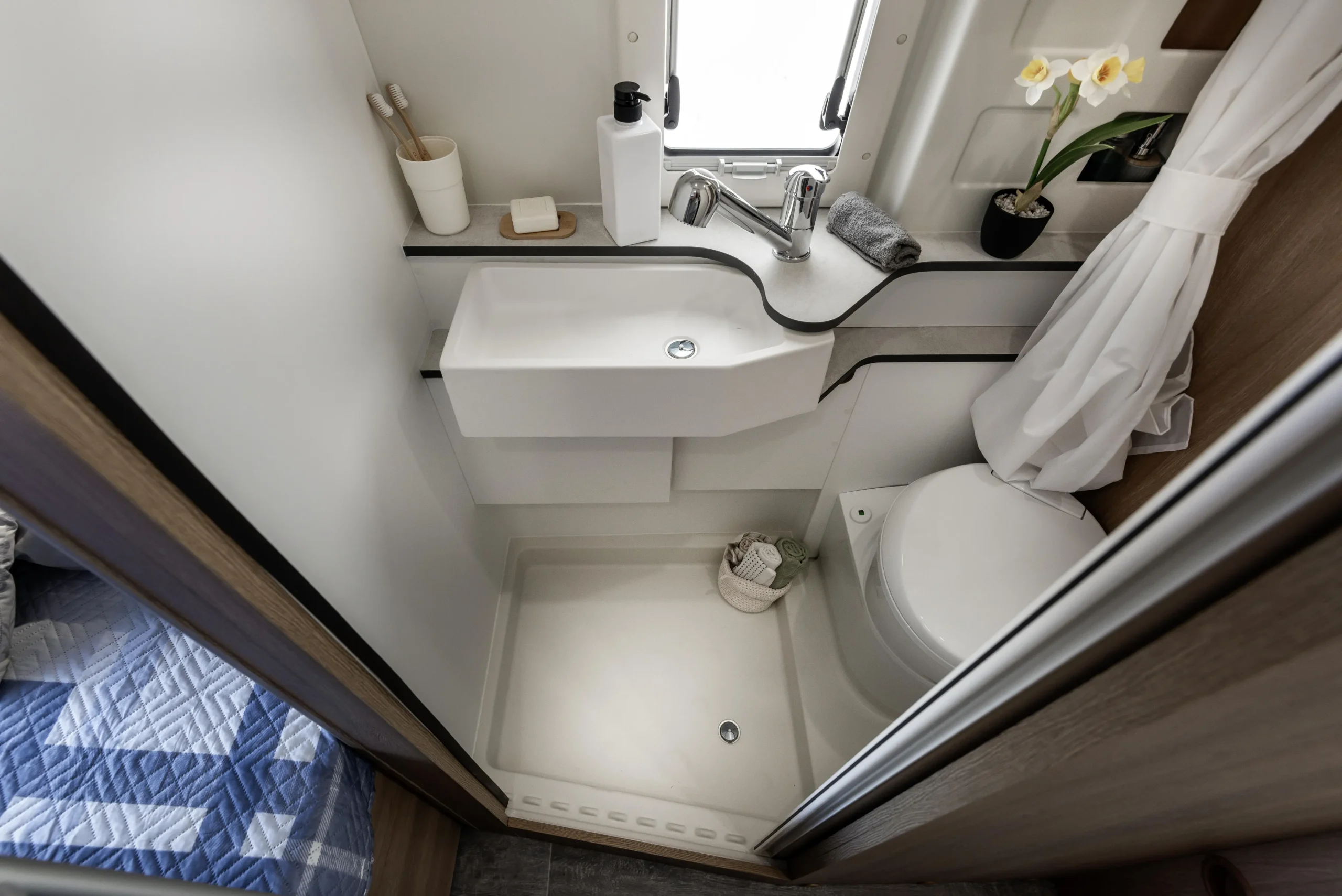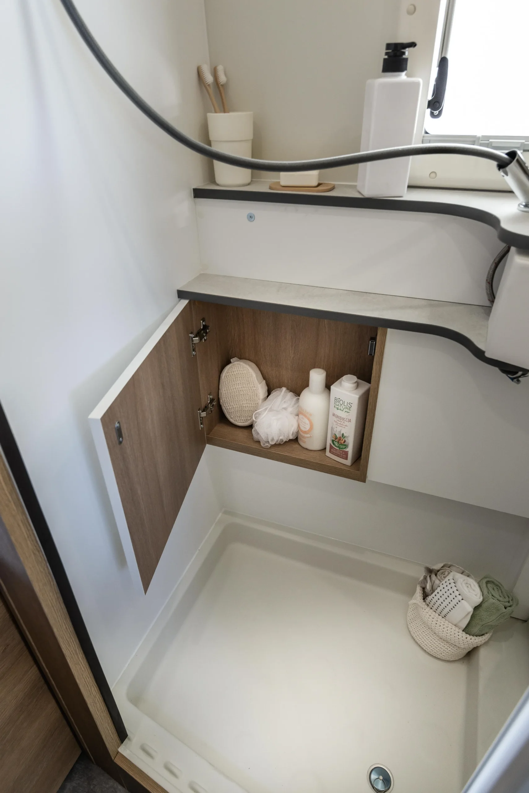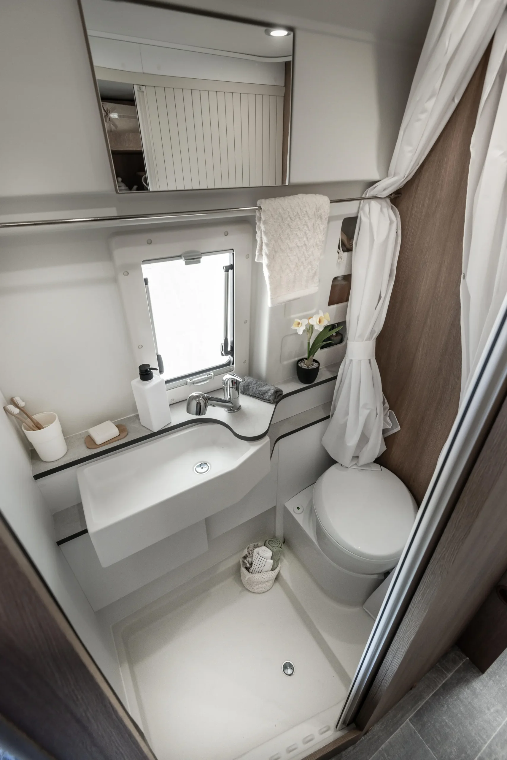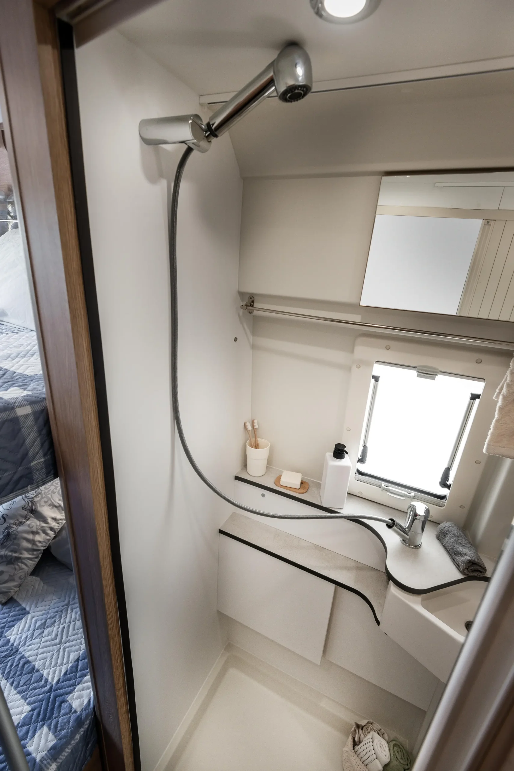 En su interior se destacan las literas dobles traseras (133 × 186 cm la inferior / 124 × 186 cm la superior), una cocina equipada con encimera amplia y nevera de compresor de 90 L, además de un baño con ducha integrada tipo “VARIO” y sistema de calefacción Truma Combi C 4000. La zona de día es luminosa y bien organizada, con espacio de almacenamiento pensado para equipaje o material deportivo, lo que le aporta al vehículo un perfil versátil tanto para viajes activos como para convivir cómodamente a bordo.