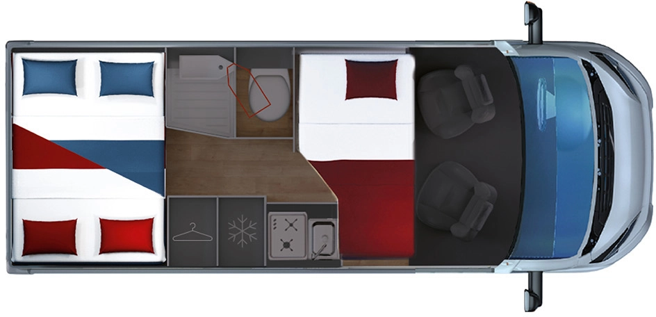 La autocaravana Giottiline Van 60B, basada en un Citroën Jumper con motor de 140 CV, ofrece una combinación ideal de confort y funcionalidad. Sus dimensiones exteriores son 5.99 m de longitud, 2.05 m de ancho y 2.59 m de altura. Homologada para cuatro personas, tiene capacidad para dormir cinco y comer cuatro personas.