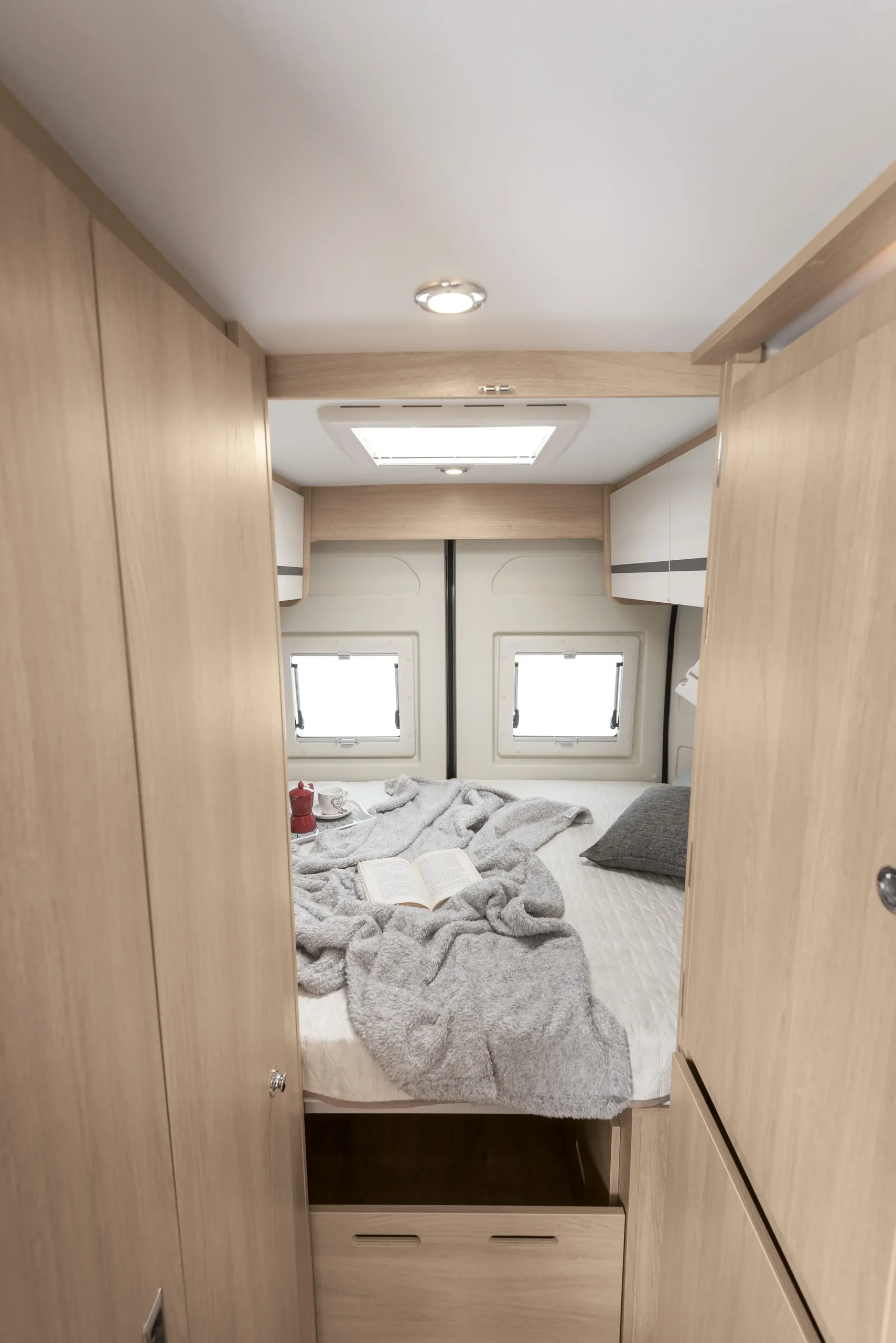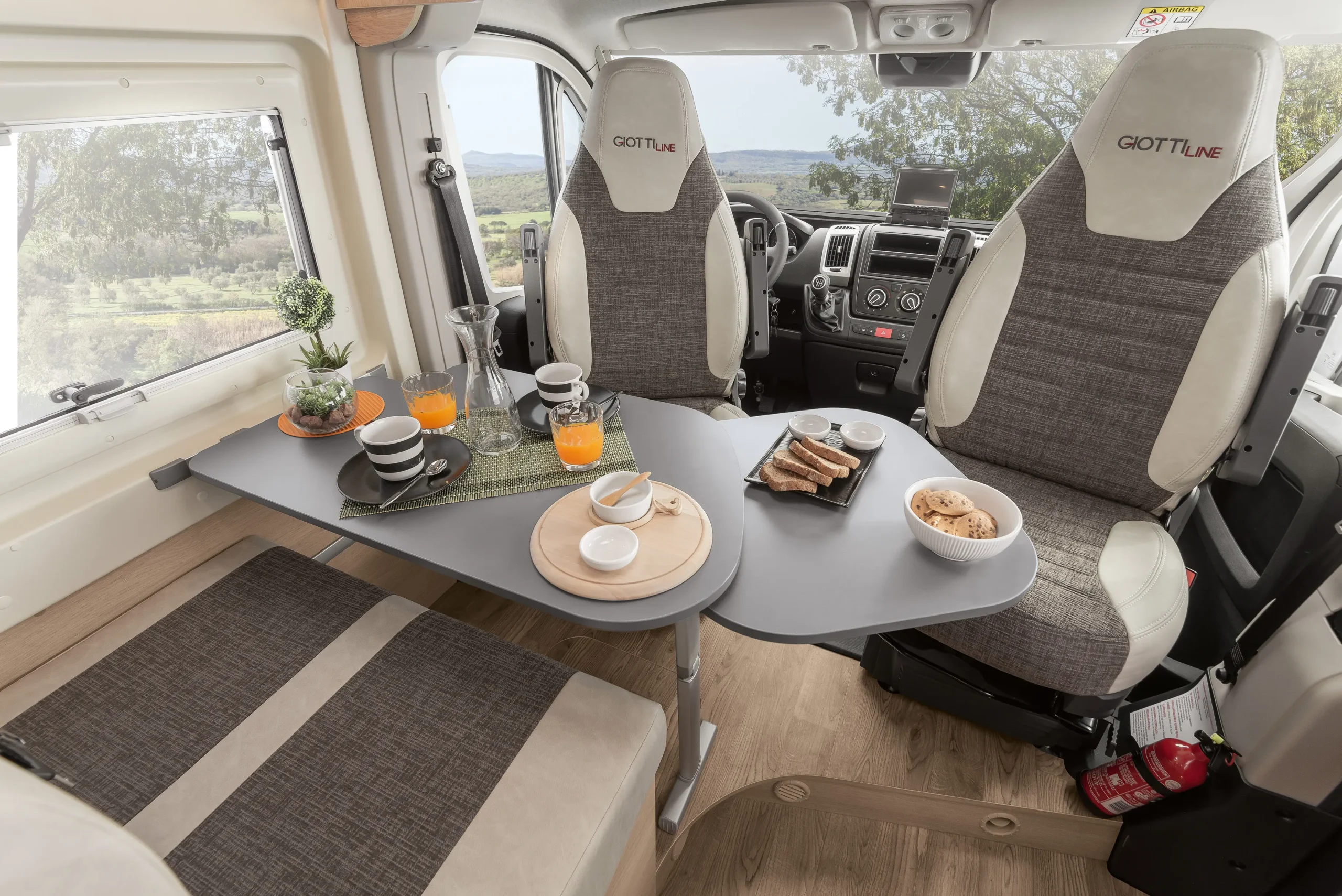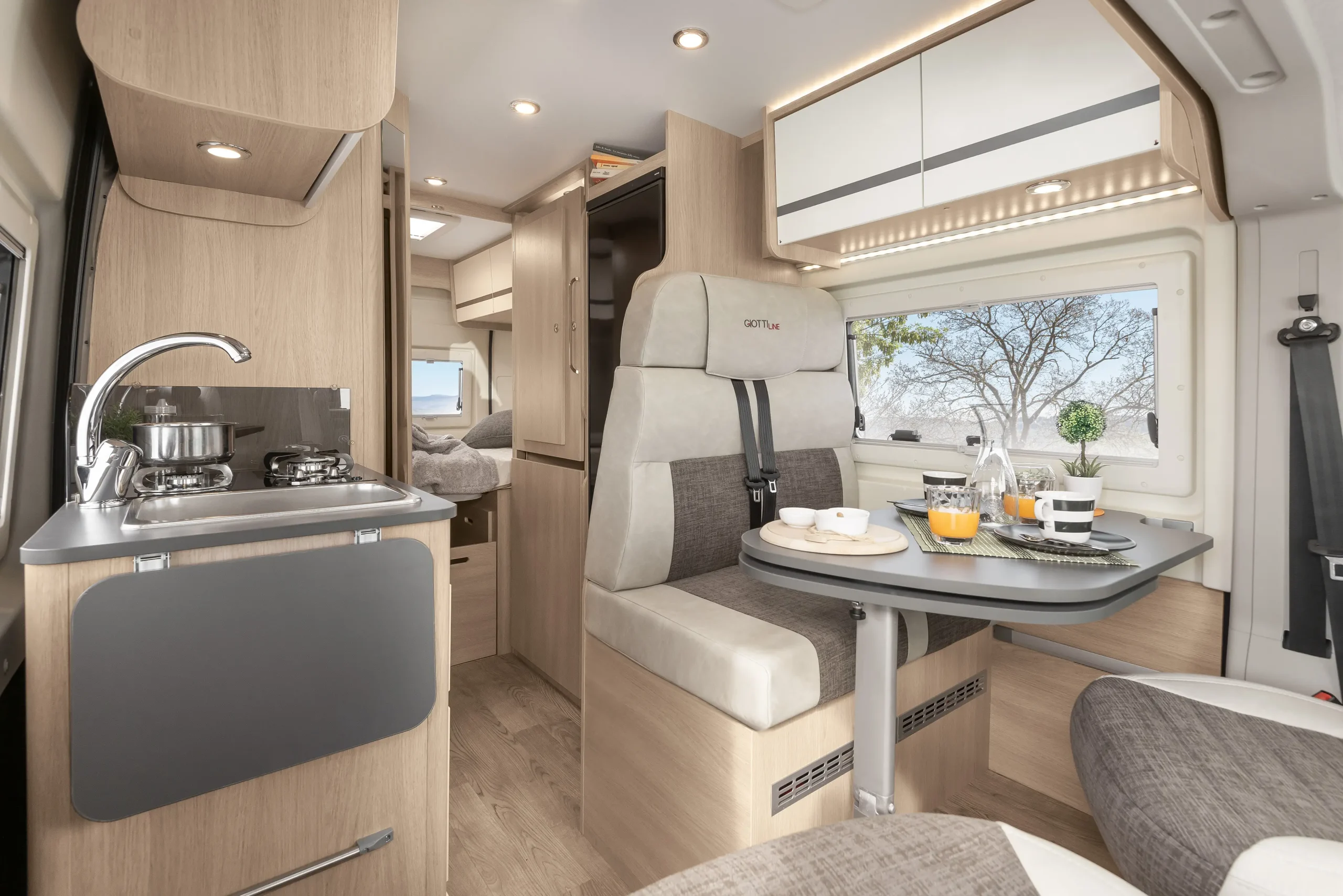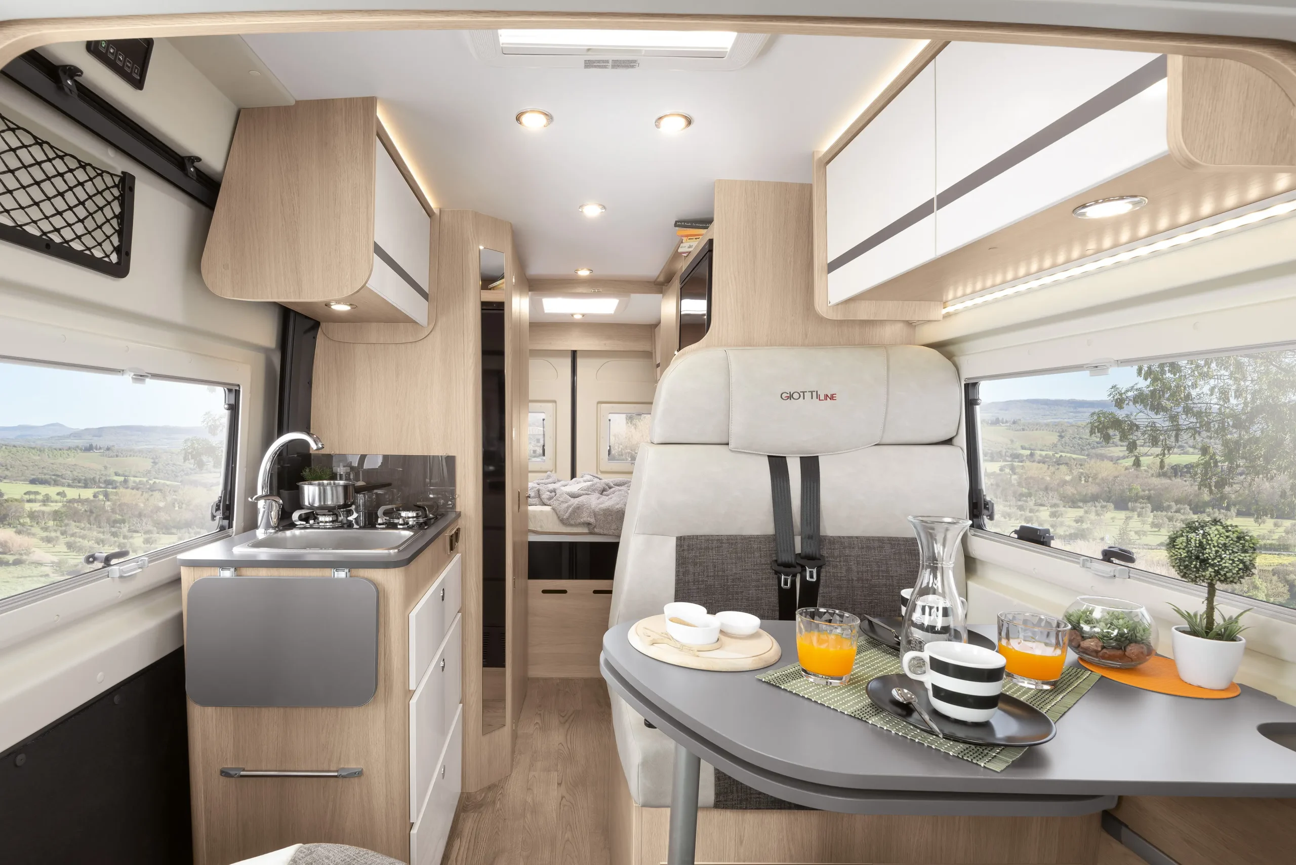 La Giottiline Van 60T es una camper versátil que combina la comodidad de una gran autocaravana con la agilidad de un vehículo compacto. Su distribución interior ha sido pensada para quienes buscan viajar con estilo sin renunciar a la funcionalidad, ofreciendo un equilibrio perfecto entre espacio, confort y diseño italiano.