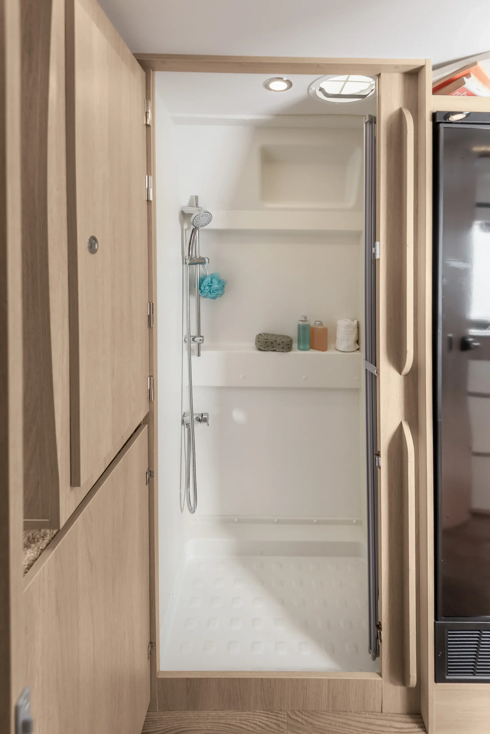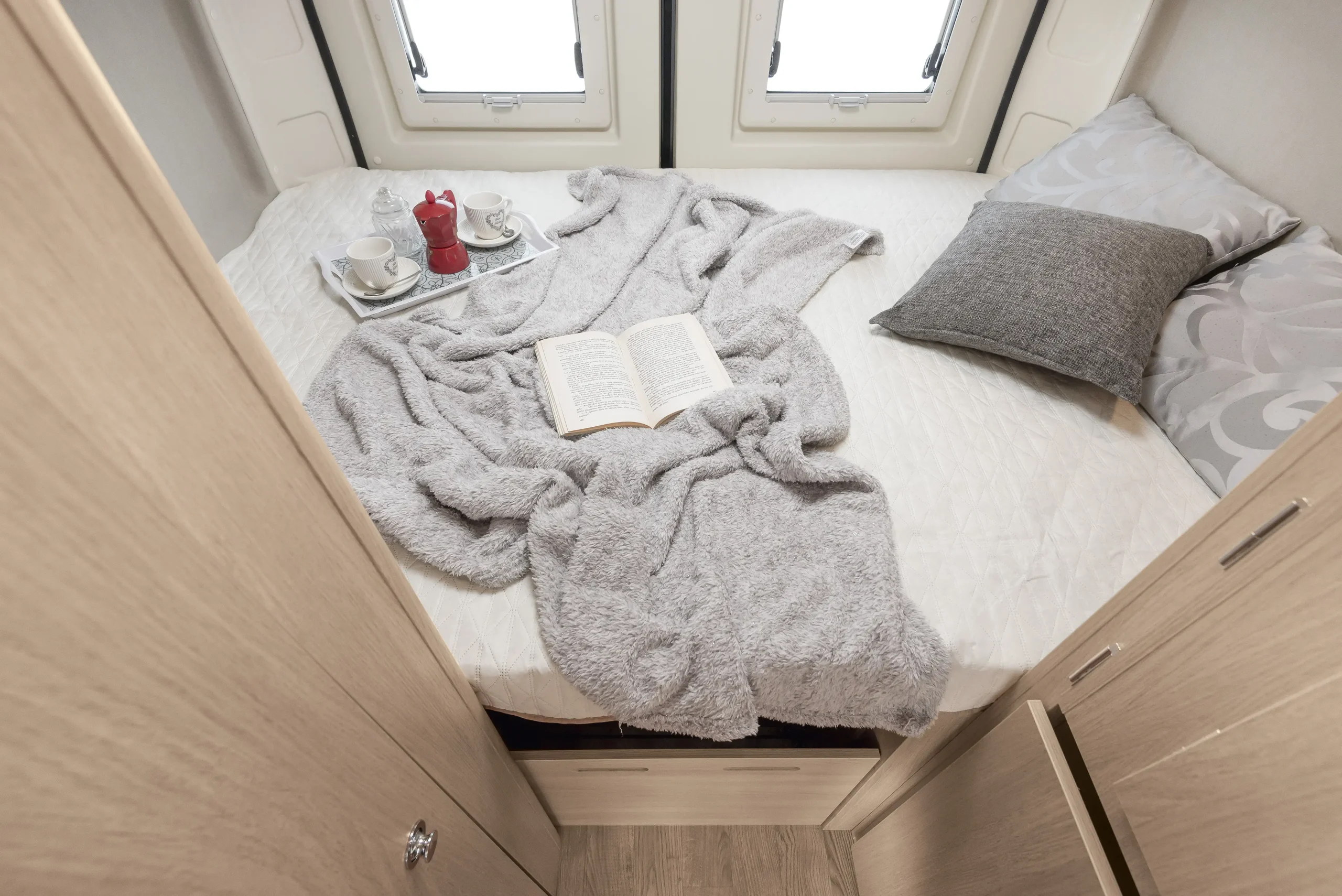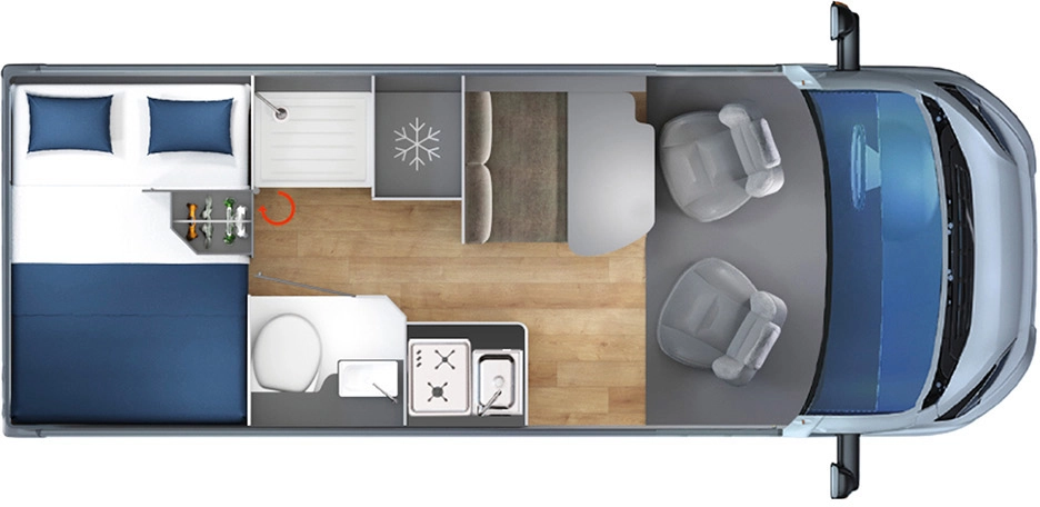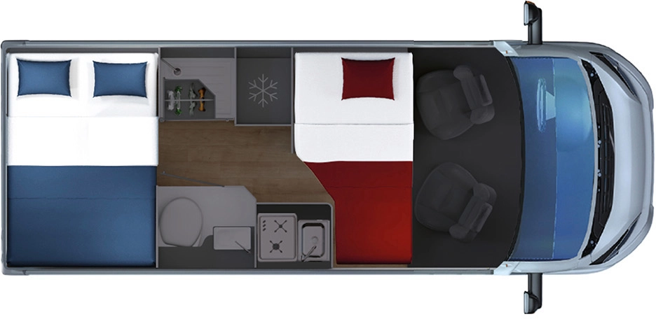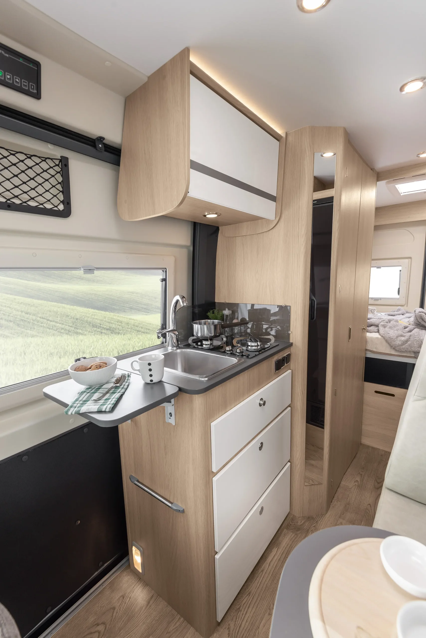 En su interior encontramos dos camas individuales convertibles en una gran cama doble, una cocina completamente equipada y un baño con ducha integrado, todo ello con materiales de alta calidad y acabados modernos. La excelente gestión del espacio y la luminosidad interior crean un ambiente acogedor y práctico para disfrutar cada momento del viaje.