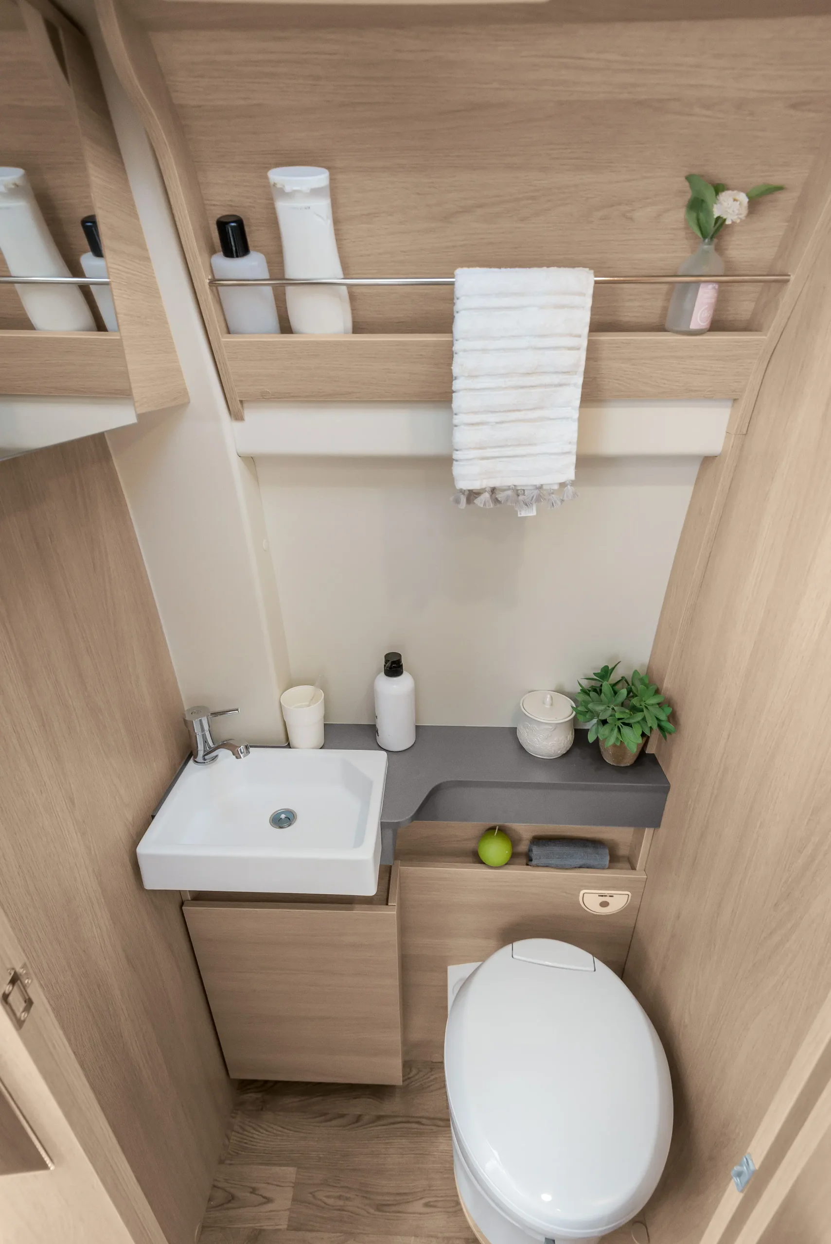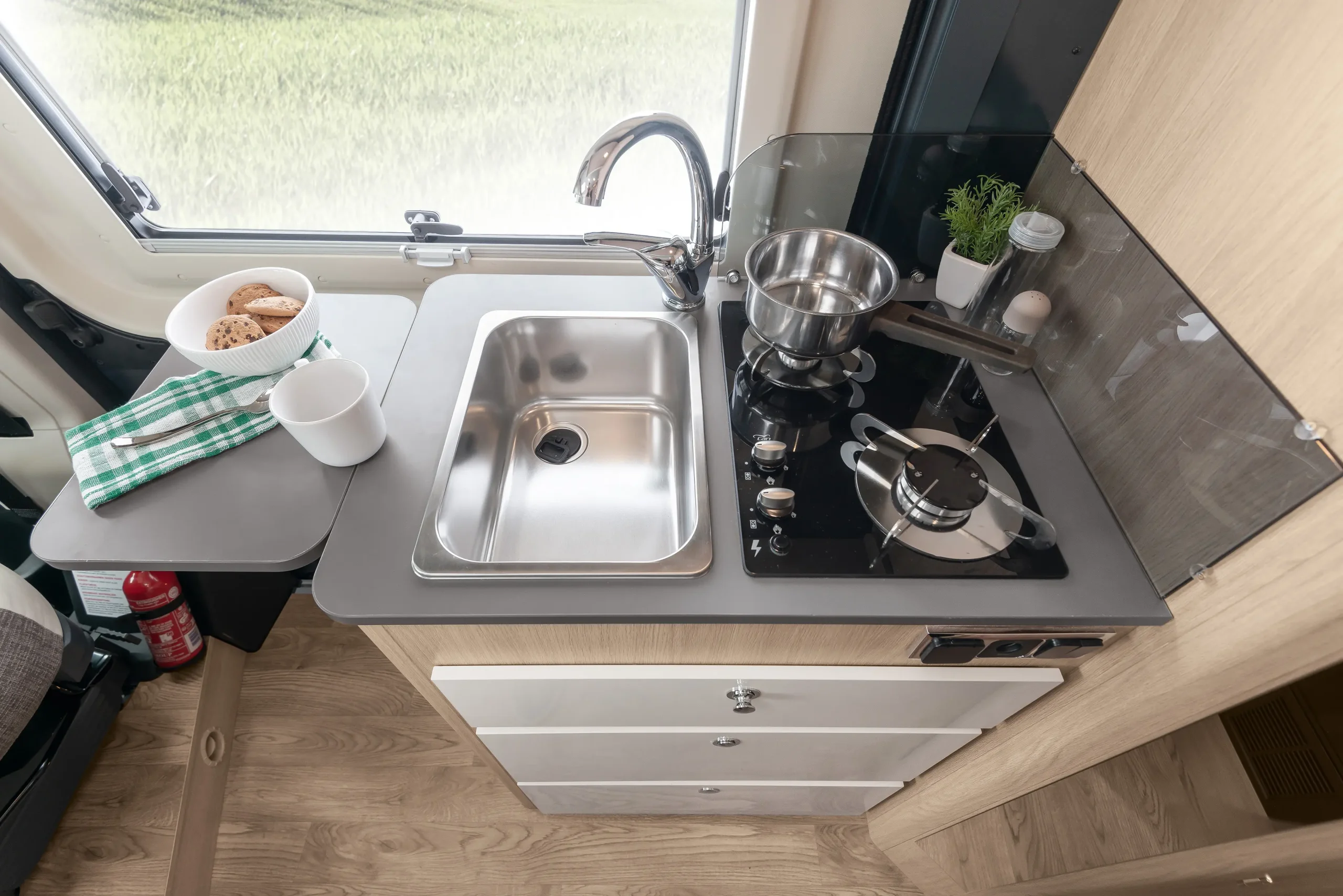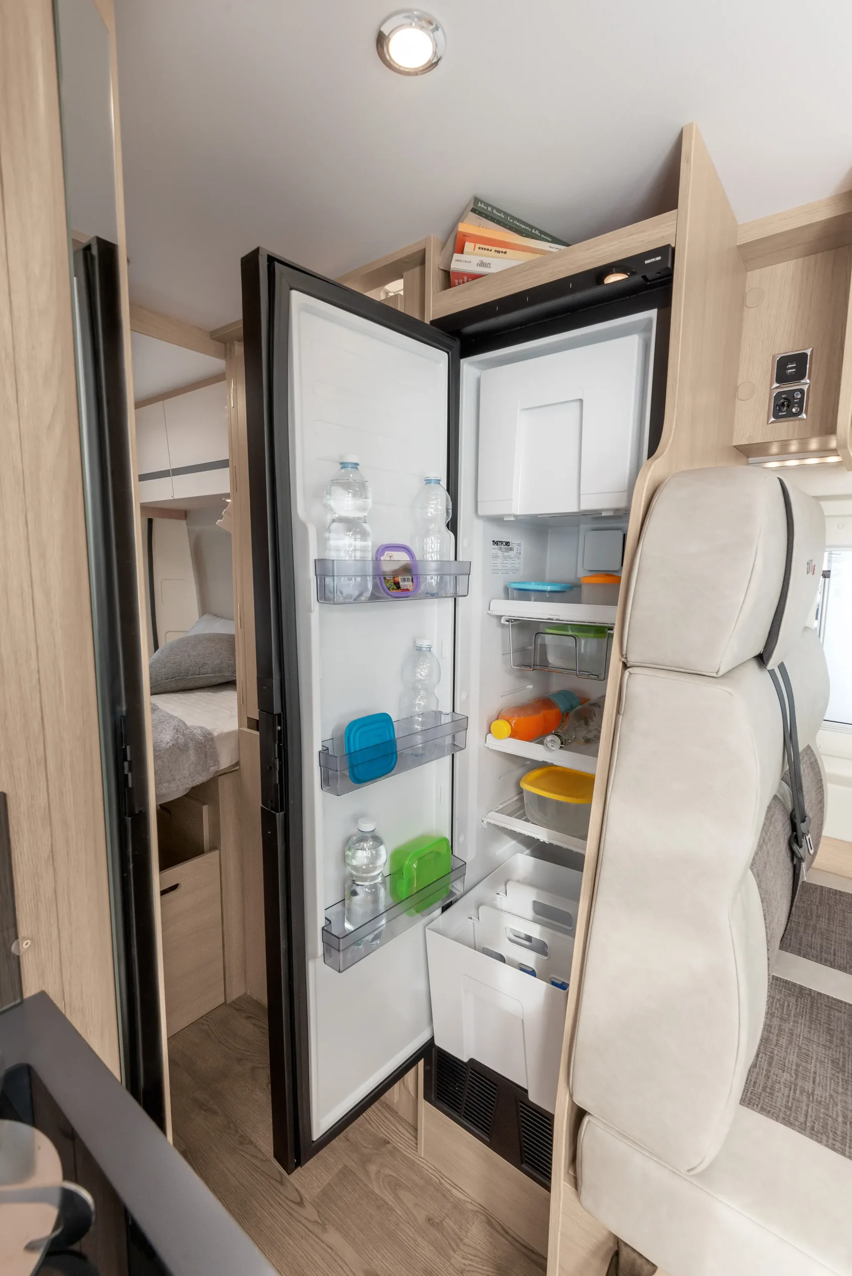 En su interior encontramos dos camas individuales convertibles en una gran cama doble, una cocina completamente equipada y un baño con ducha integrado, todo ello con materiales de alta calidad y acabados modernos. La excelente gestión del espacio y la luminosidad interior crean un ambiente acogedor y práctico para disfrutar cada momento del viaje.
