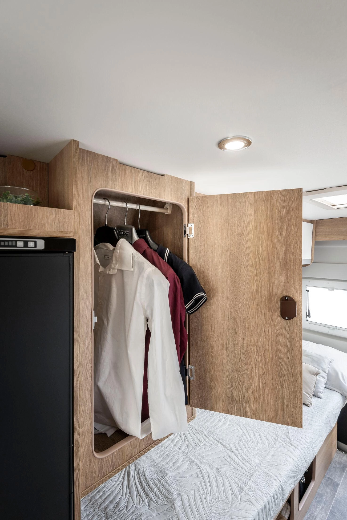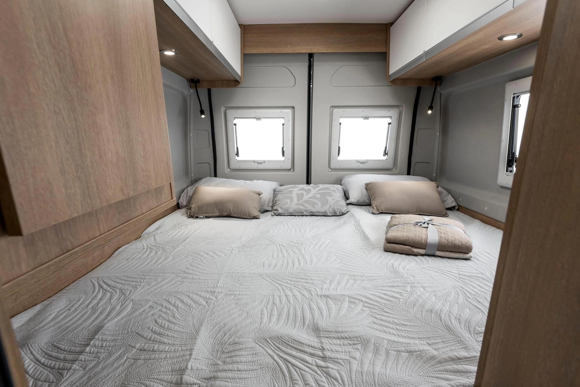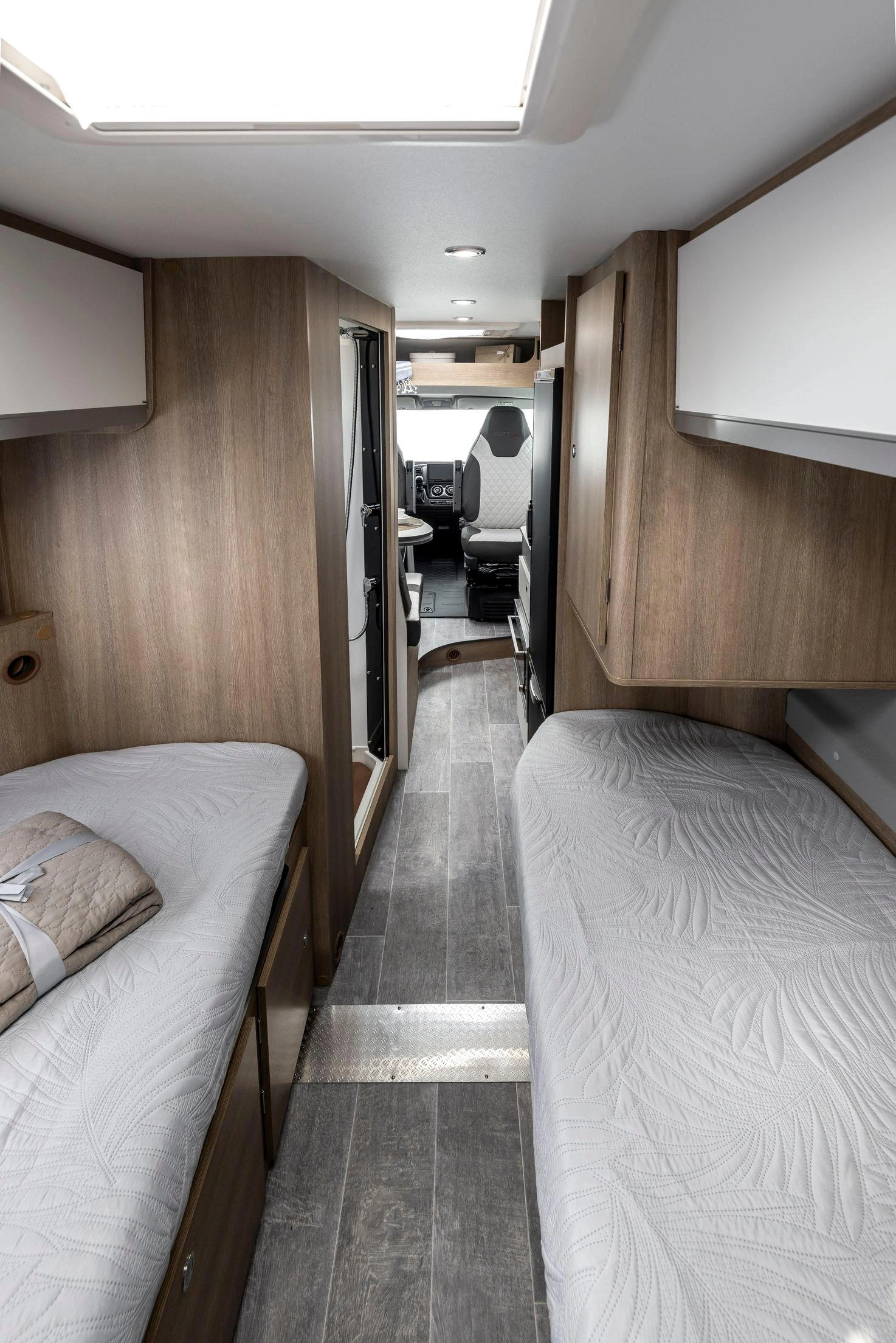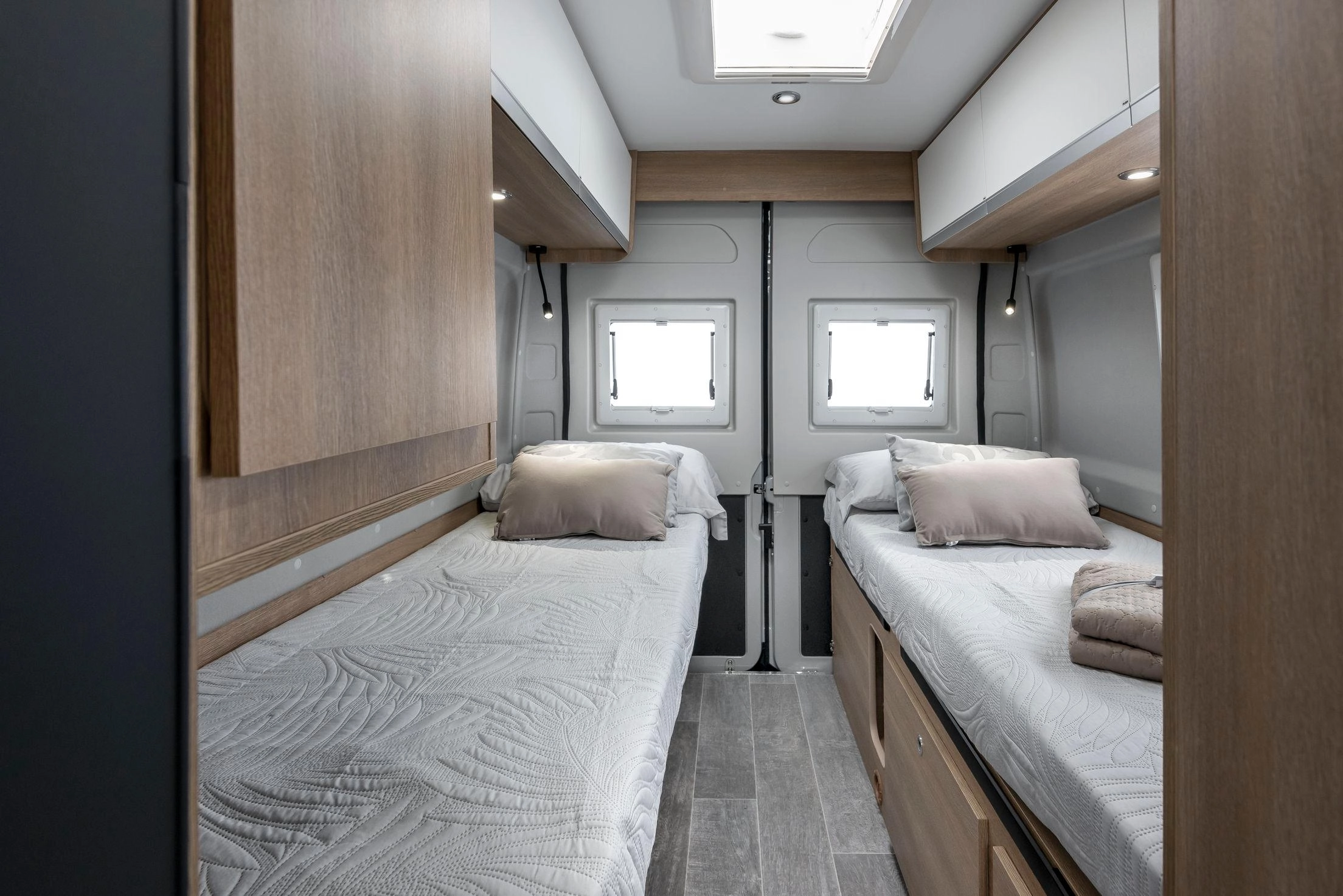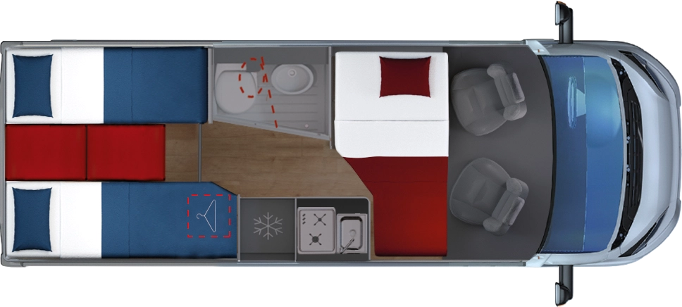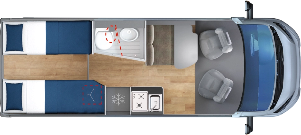 En la parte trasera incorpora camas gemelas que se pueden unir para formar un gran lecho tipo king-size (209 × 186 cm aprox.) con un pasillo central que permite almacenar bicicletas, equipo o equipaje. El frigorífico de 135 L y el equipamiento de alta calidad aseguran autonomía y comodidad en cualquier ruta.