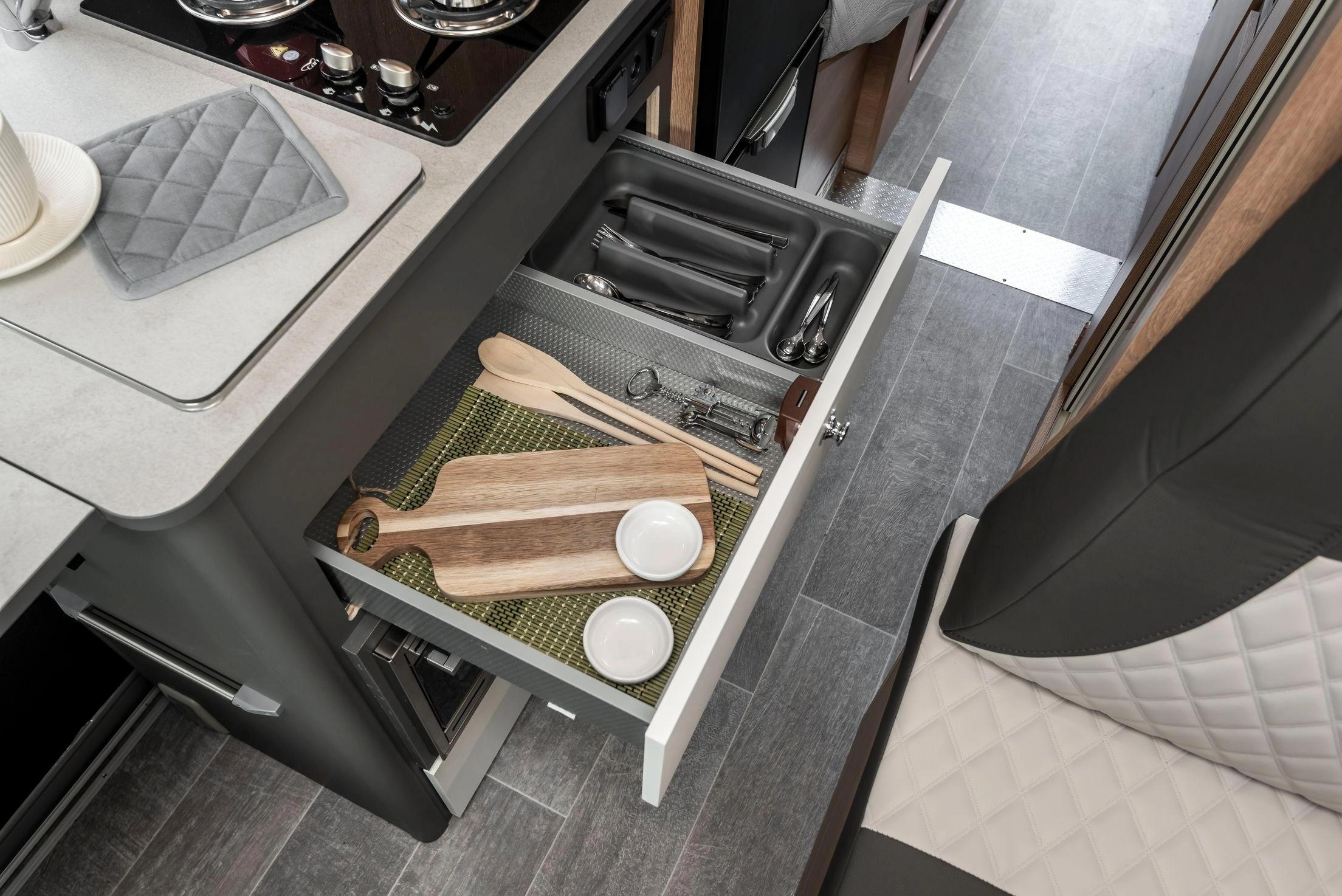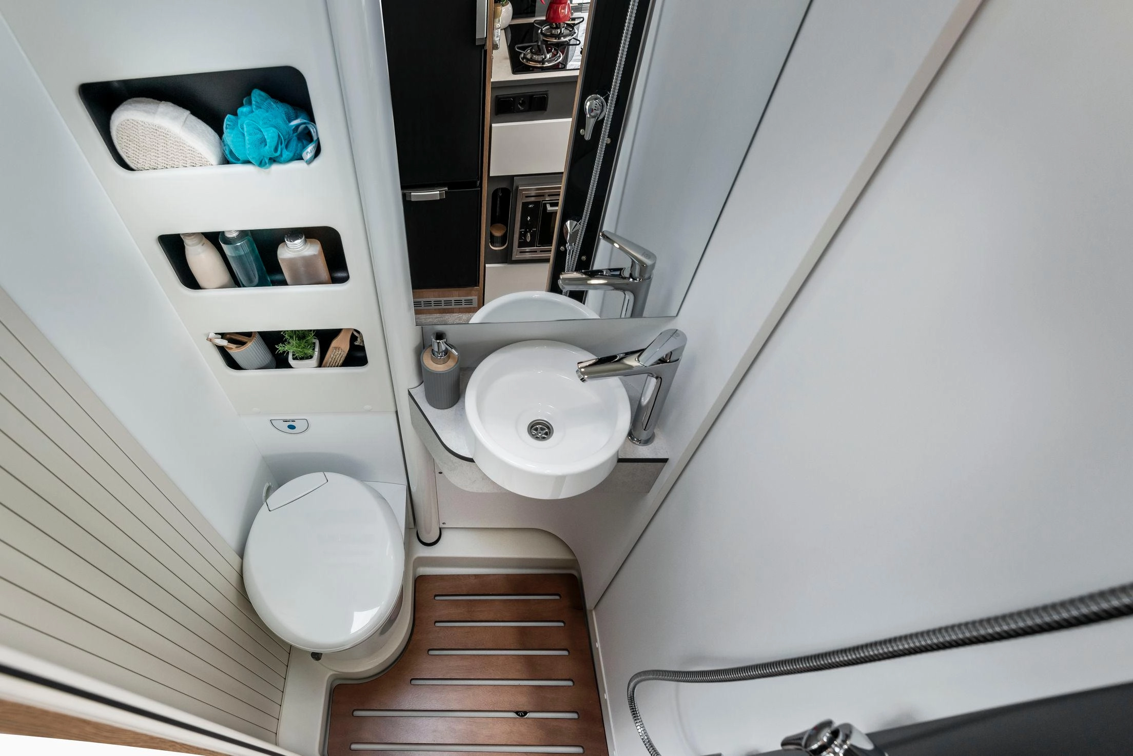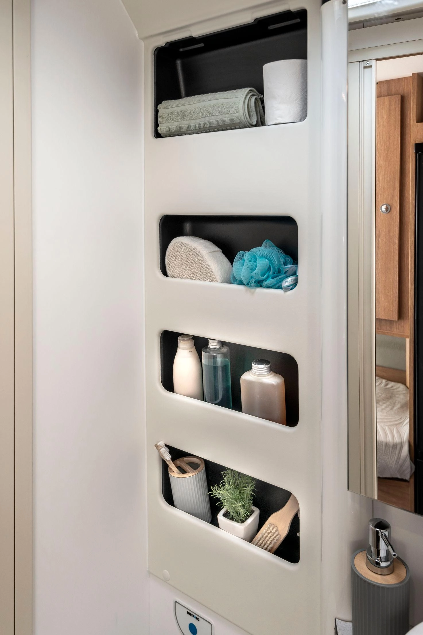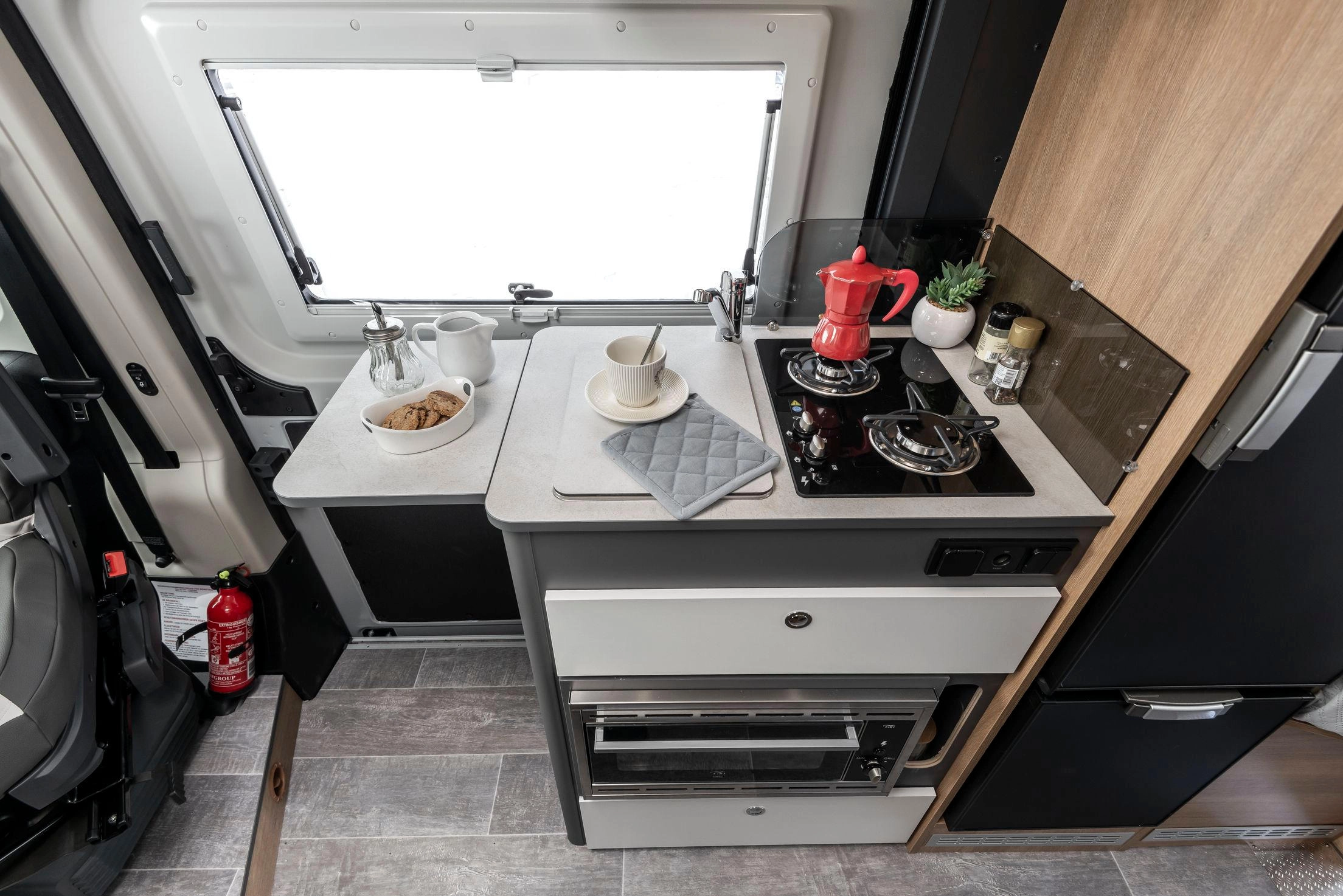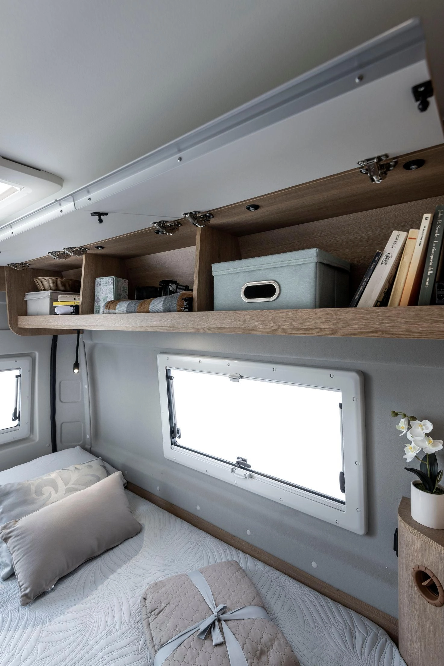 En la parte trasera incorpora camas gemelas que se pueden unir para formar un gran lecho tipo king-size (209 × 186 cm aprox.) con un pasillo central que permite almacenar bicicletas, equipo o equipaje. El frigorífico de 135 L y el equipamiento de alta calidad aseguran autonomía y comodidad en cualquier ruta.